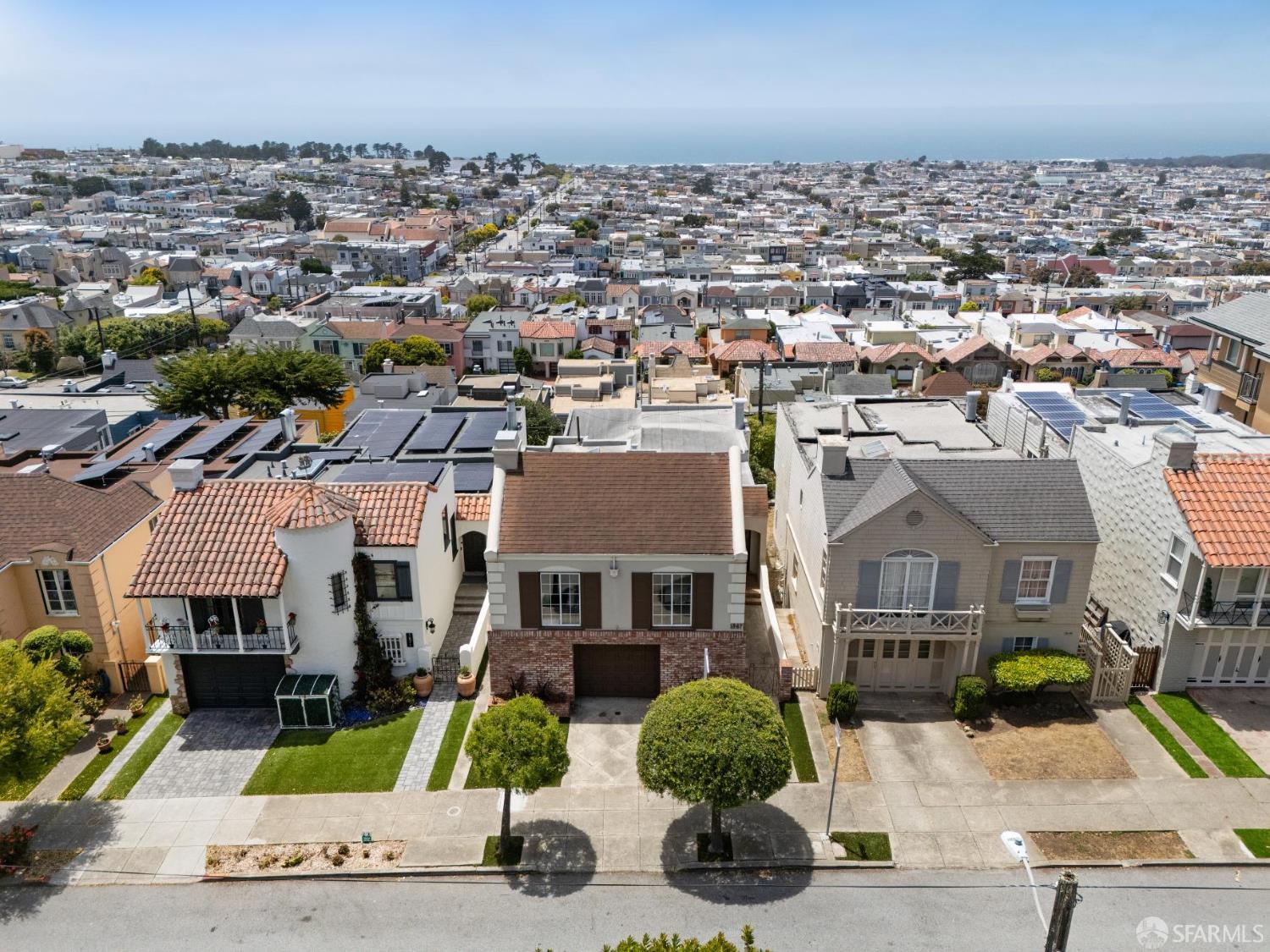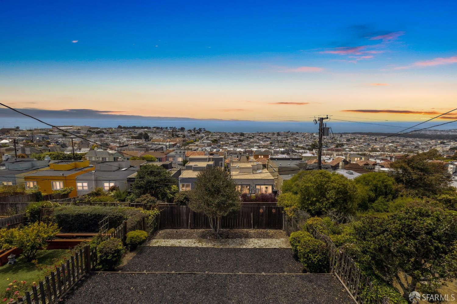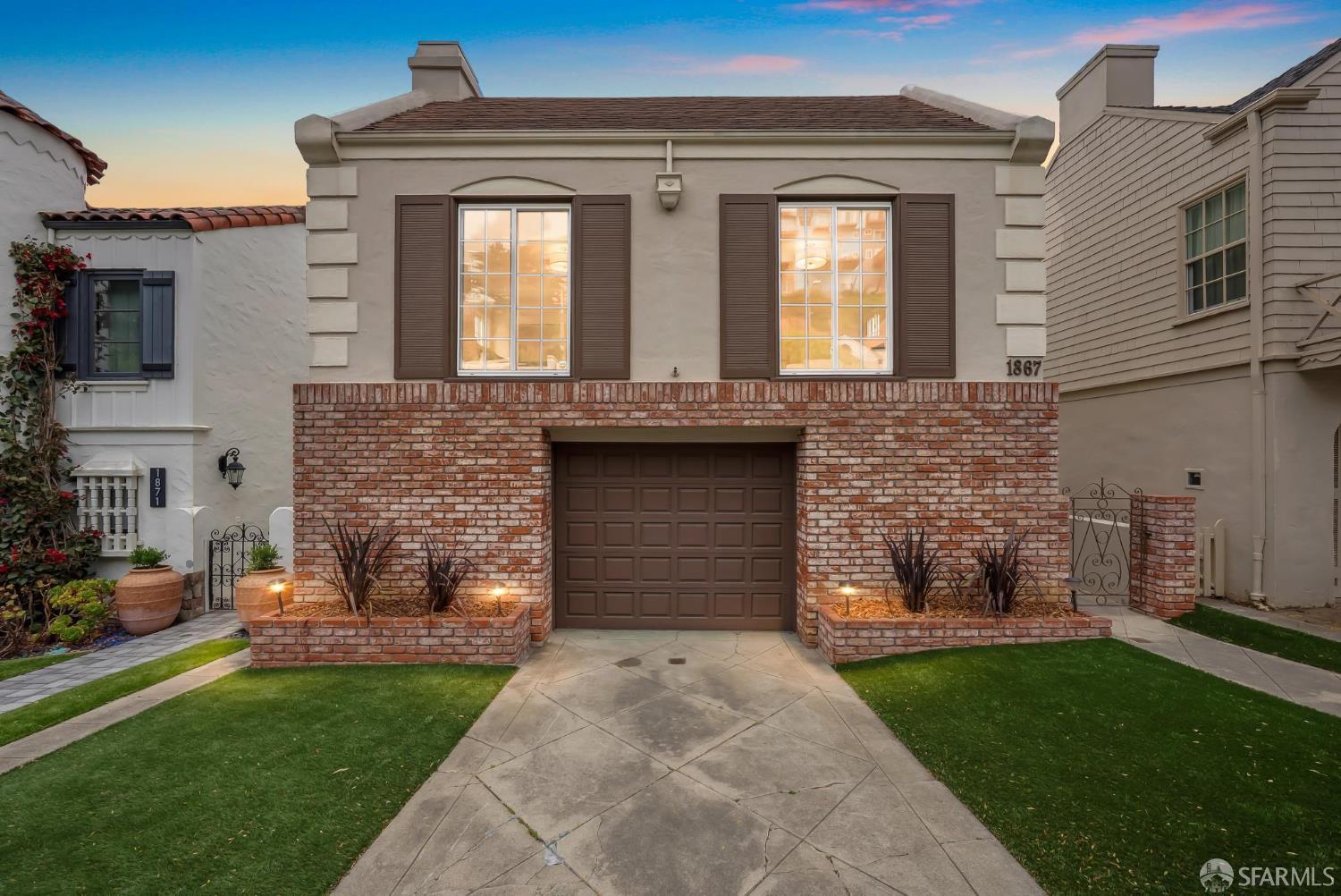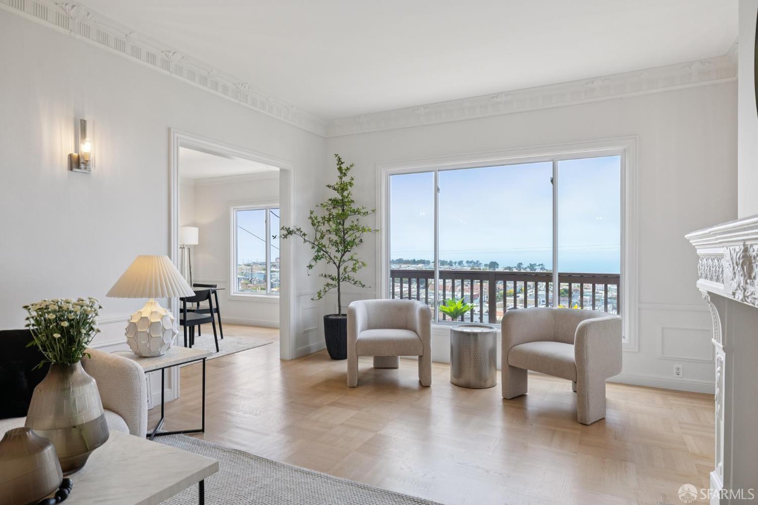 Welcome home to breath-taking ocean views & sunsets in this enchanting 1938 Rousseau-style residence, where vintage charm blends with modern living. Located in highly desirable Golden Gate Heights, this bright and spacious 3BD/2BA, 2,426 +/- square foot split-level home offers unobstructed water vistas and a charming street facing facade with red brick siding. The main level boasts formal living & dining rooms with wood-burning fireplace, tall ceilings, newly refinished parquet hardwood floors, original intricate crown moldings, and a large eat-in kitchen with skylight and Sub-Zero refrigerator-providing a canvas for creating the perfect culinary space. The upper level offers two spacious bedroom retreats, a jacuzzi tub bathroom, and multiple good-sized closets. The lower-level features huge views from a family room with wet bar & fireplace, an additional bedroom & bathroom, along with a kitchenette, utilities, and expansive storage room. Additional highlights: new custom paint & modern lighting throughout, newly refinished hardwood floors, double paned windows, deep terraced garden with brick patio, roomy garage with laundry & ample storage. Walk to iconic 16th Avenue Mosaic stairs & Grandview Park, and just minutes to West Portal and Irving Street shopping and dining corridors!