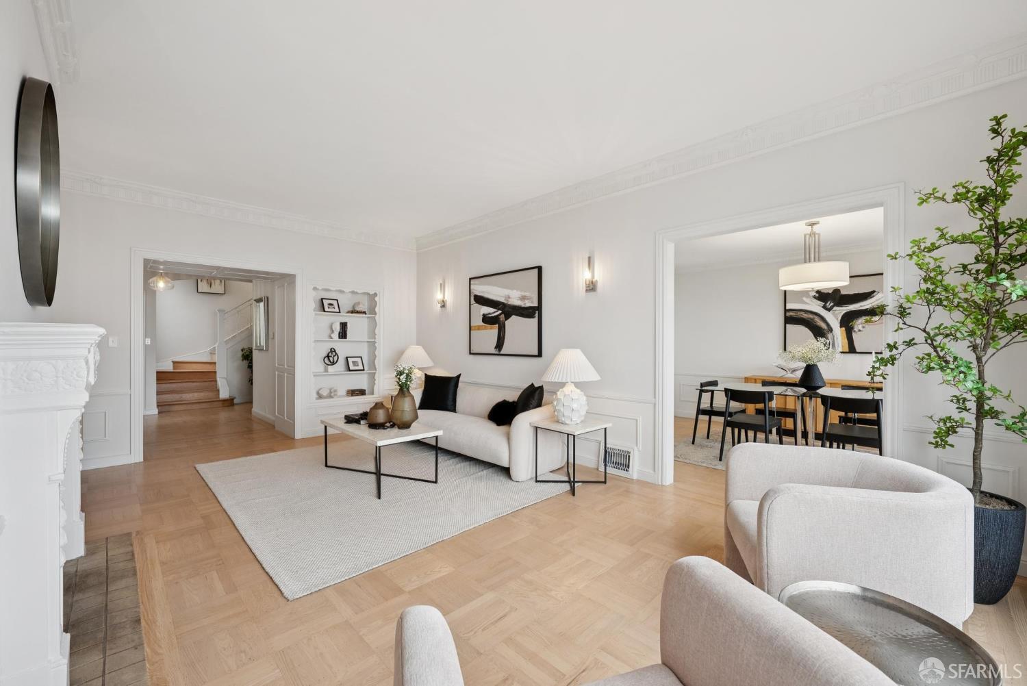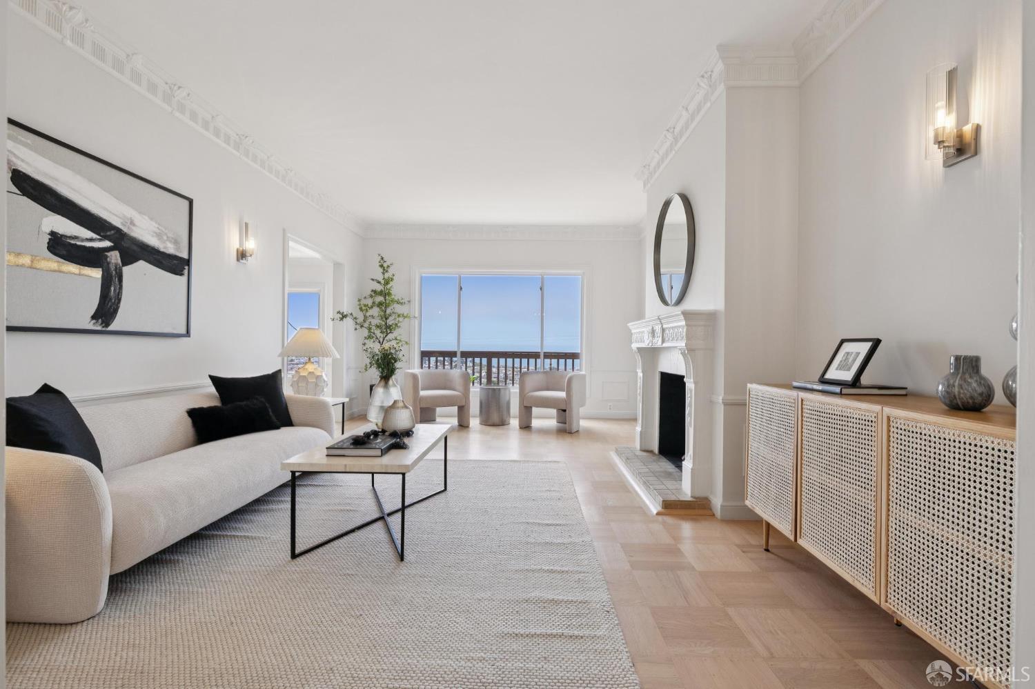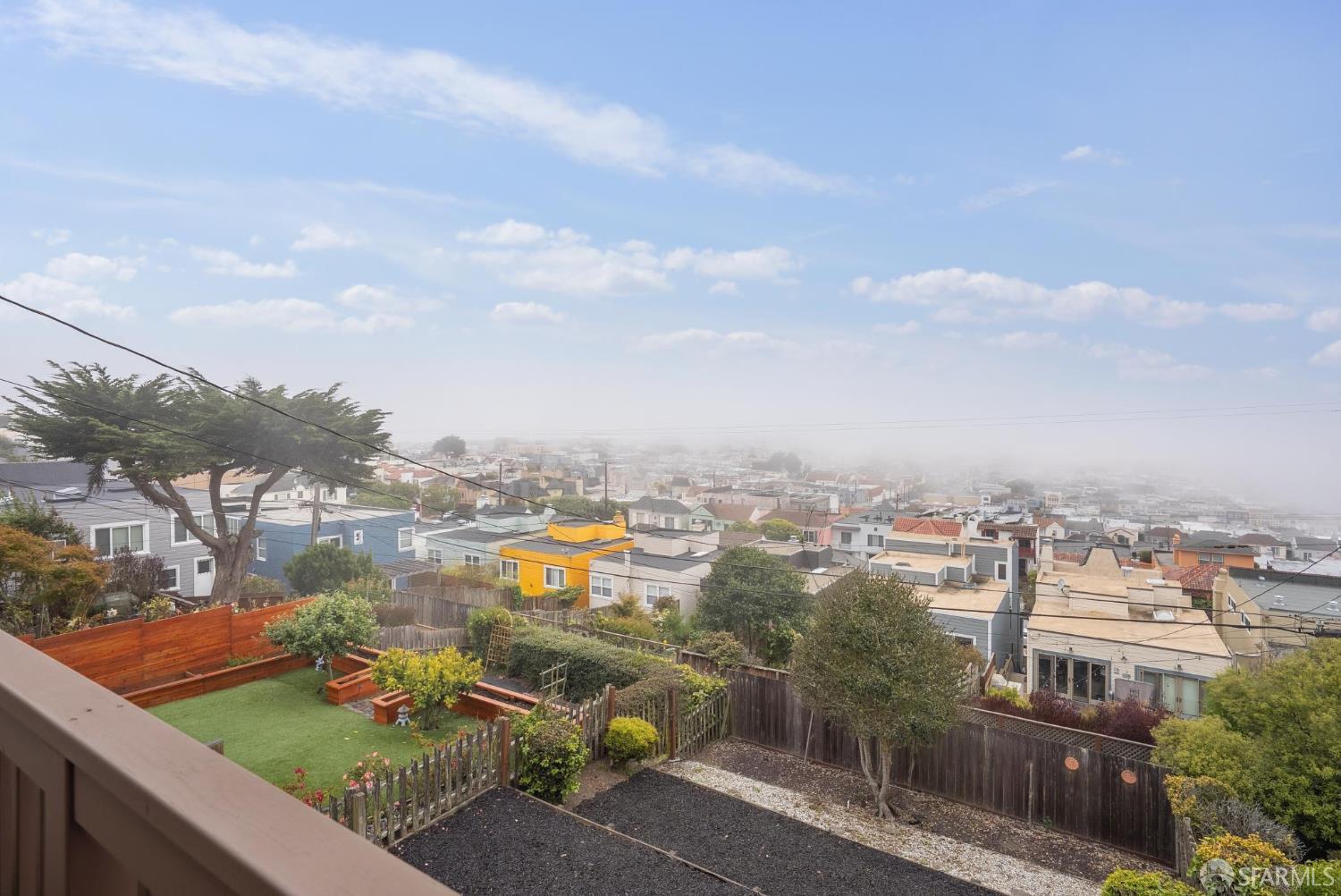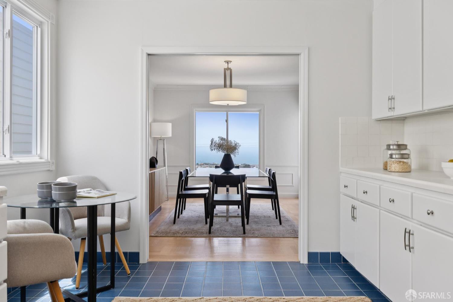 Welcome home to breath-taking ocean views & sunsets in this enchanting 1938 Rousseau-style residence, where vintage charm blends with modern living. Located in highly desirable Golden Gate Heights, this bright and spacious 3BD/2BA, 2,426 +/- square foot split-level home offers unobstructed water vistas and a charming street facing facade with red brick siding. The main level boasts formal living & dining rooms with wood-burning fireplace, tall ceilings, newly refinished parquet hardwood floors, original intricate crown moldings, and a large eat-in kitchen with skylight and Sub-Zero refrigerator-providing a canvas for creating the perfect culinary space. The upper level offers two spacious bedroom retreats, a jacuzzi tub bathroom, and multiple good-sized closets. The lower-level features huge views from a family room with wet bar & fireplace, an additional bedroom & bathroom, along with a kitchenette, utilities, and expansive storage room. Additional highlights: new custom paint & modern lighting throughout, newly refinished hardwood floors, double paned windows, deep terraced garden with brick patio, roomy garage with laundry & ample storage. Walk to iconic 16th Avenue Mosaic stairs & Grandview Park, and just minutes to West Portal and Irving Street shopping and dining corridors!