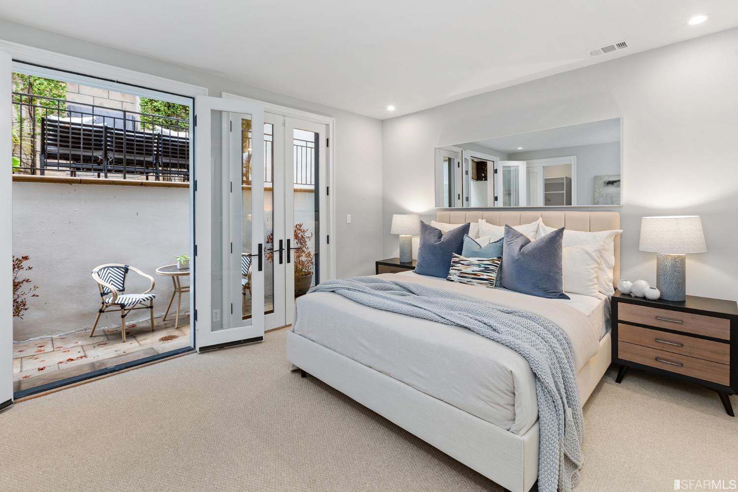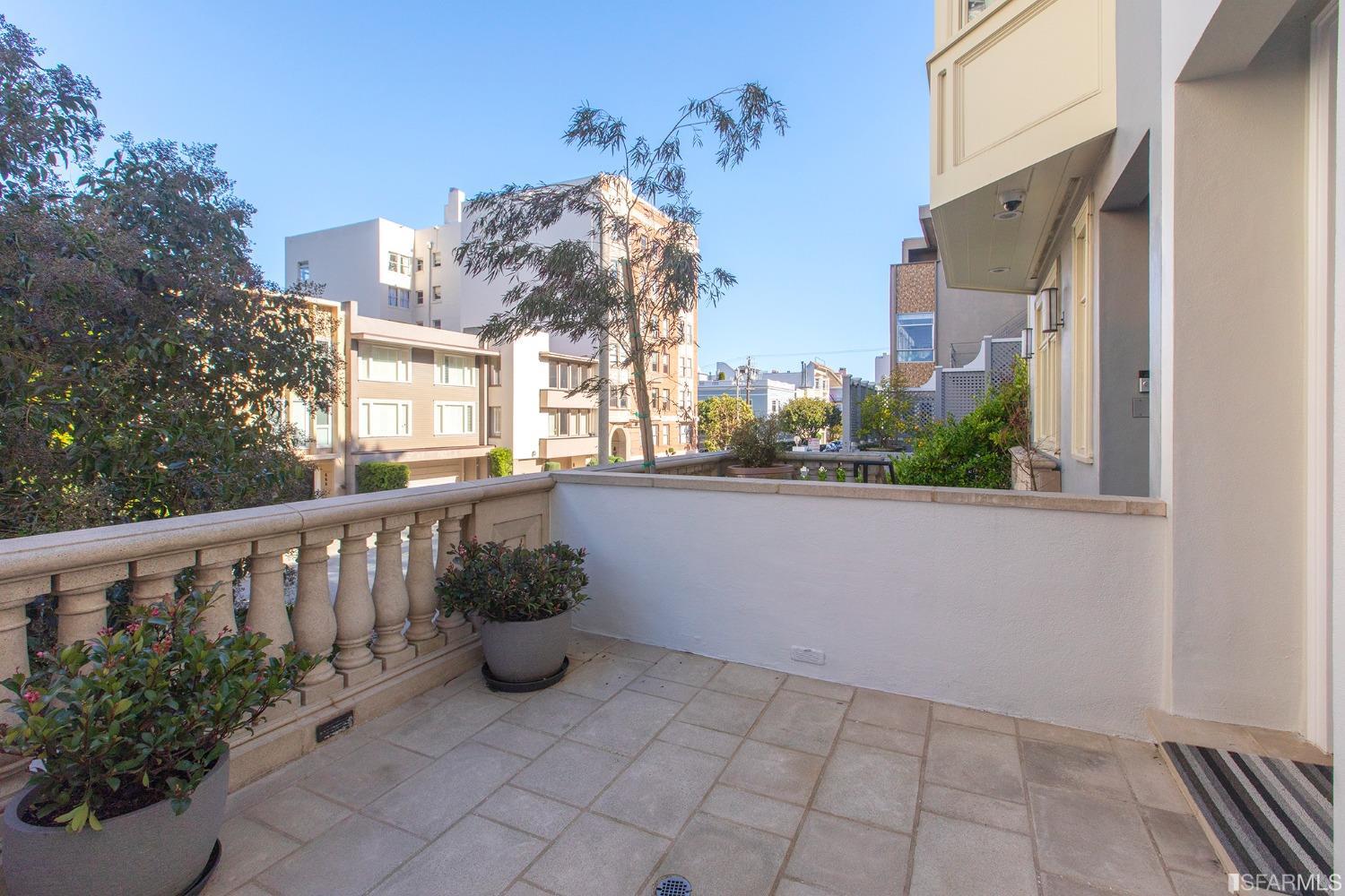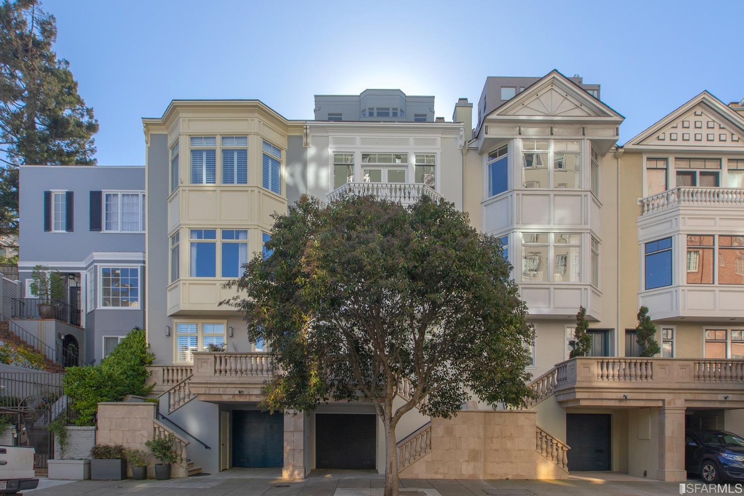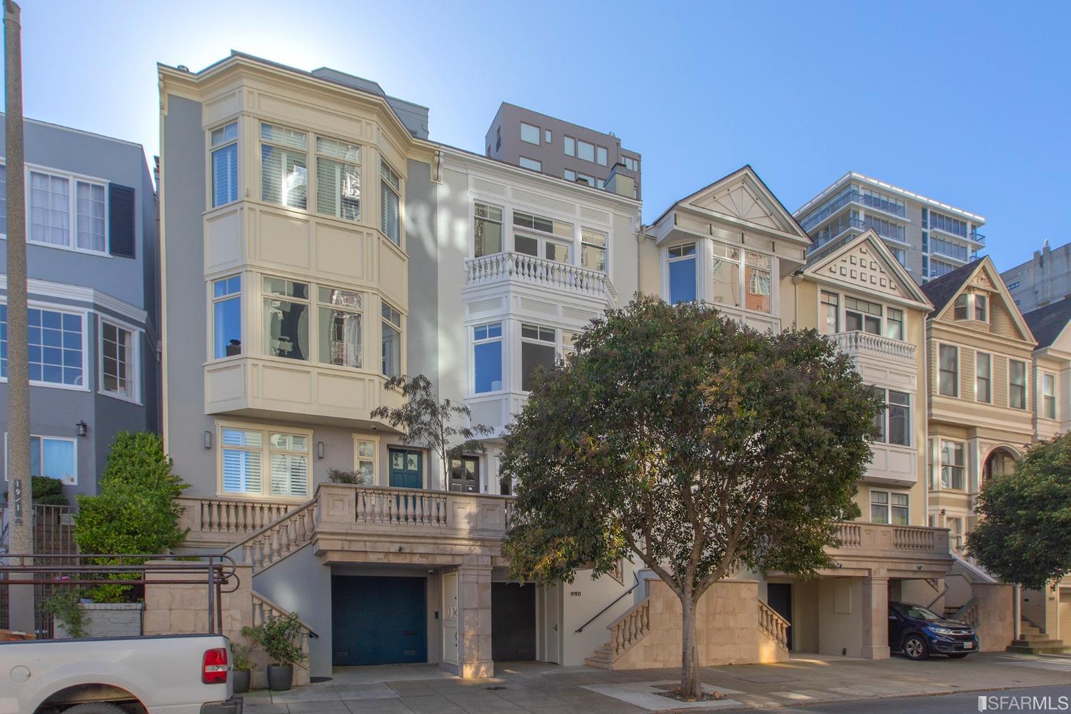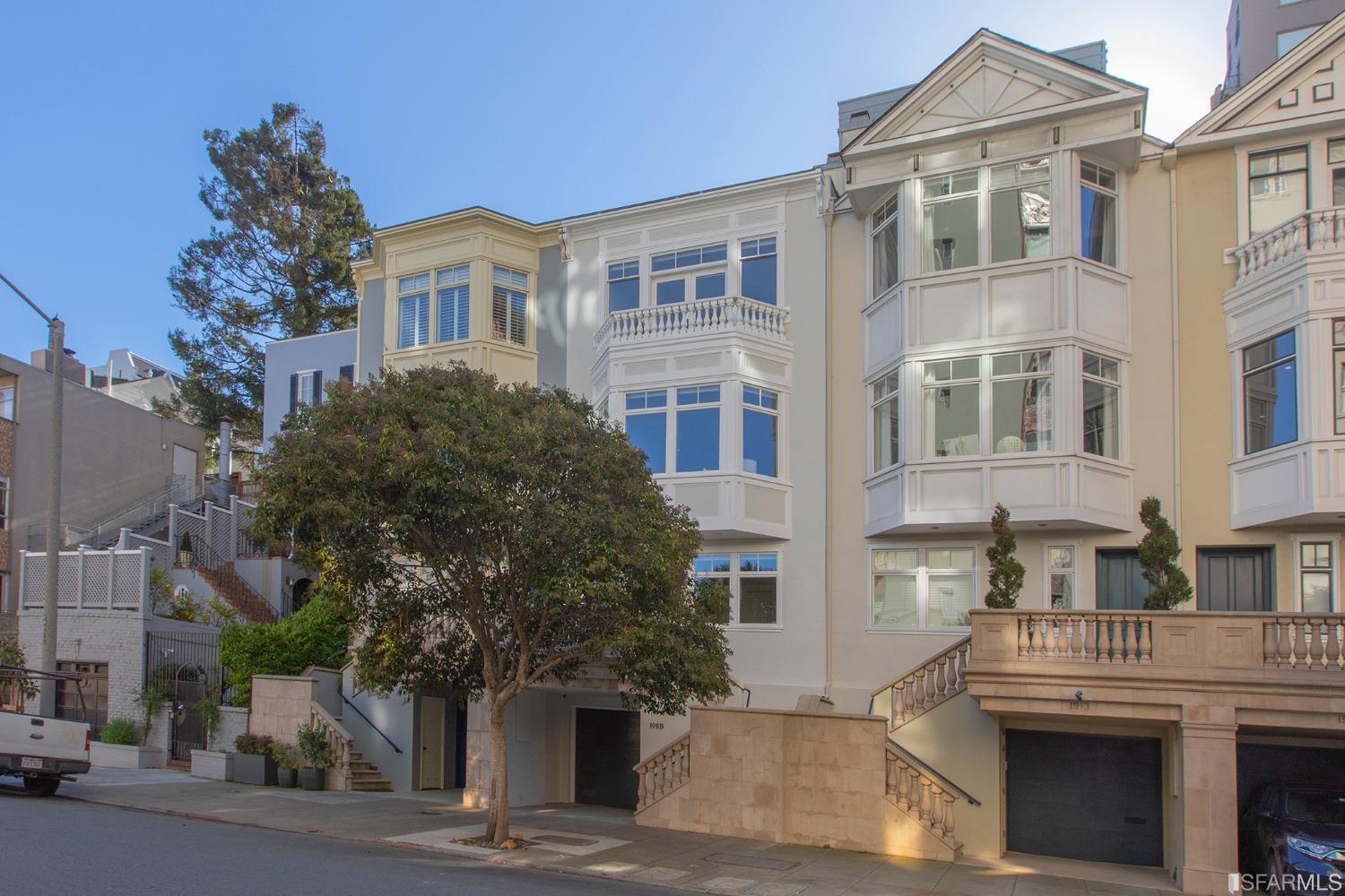 Video Preview! Northern edge of Pacific Heights, flat block close to Union St, built in 1997, 4 bed, 4 1/2 bath. Stone stairs lead from the sidewalk up to a private landing overlooking Vallejo. Four story home has living floor in the middle. Enter the foyer and up the stairs to the open living level with a dining room, wood burning fireplace and living room with bay windows. Powder room and updated kitchen are on the south side. Kitchen opens to the garden with an outdoor TV. Primary bedroom suite is on the top of the home facing north with French doors opening out to a Juliette balcony and a view of Alcatraz. The suite has built-in closets, a remodeled spacious bathroom with skylights. There is an en-suite bedroom on the south side. On the first living floor, there are two en-suite bedrooms and laundry. Rear bedroom opens to a patio. Internal stairs lead down to the mud room and a large two car garage with great storage.