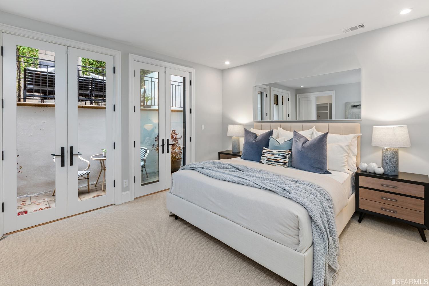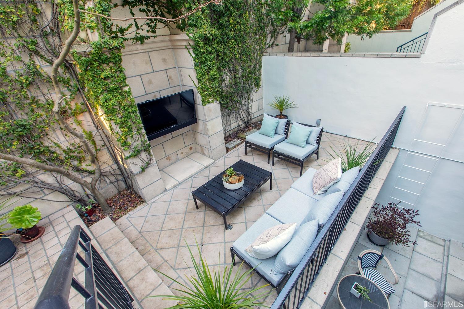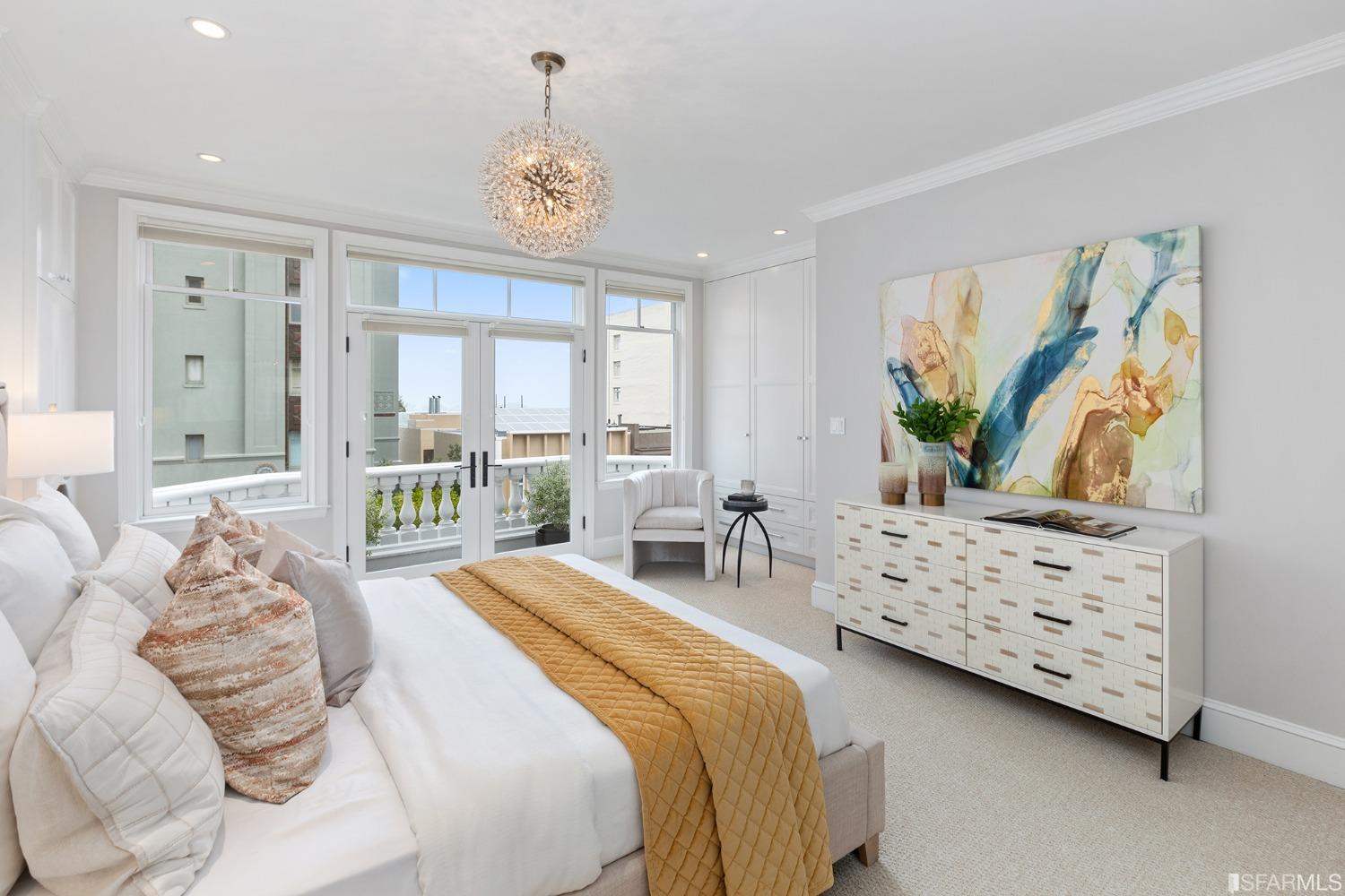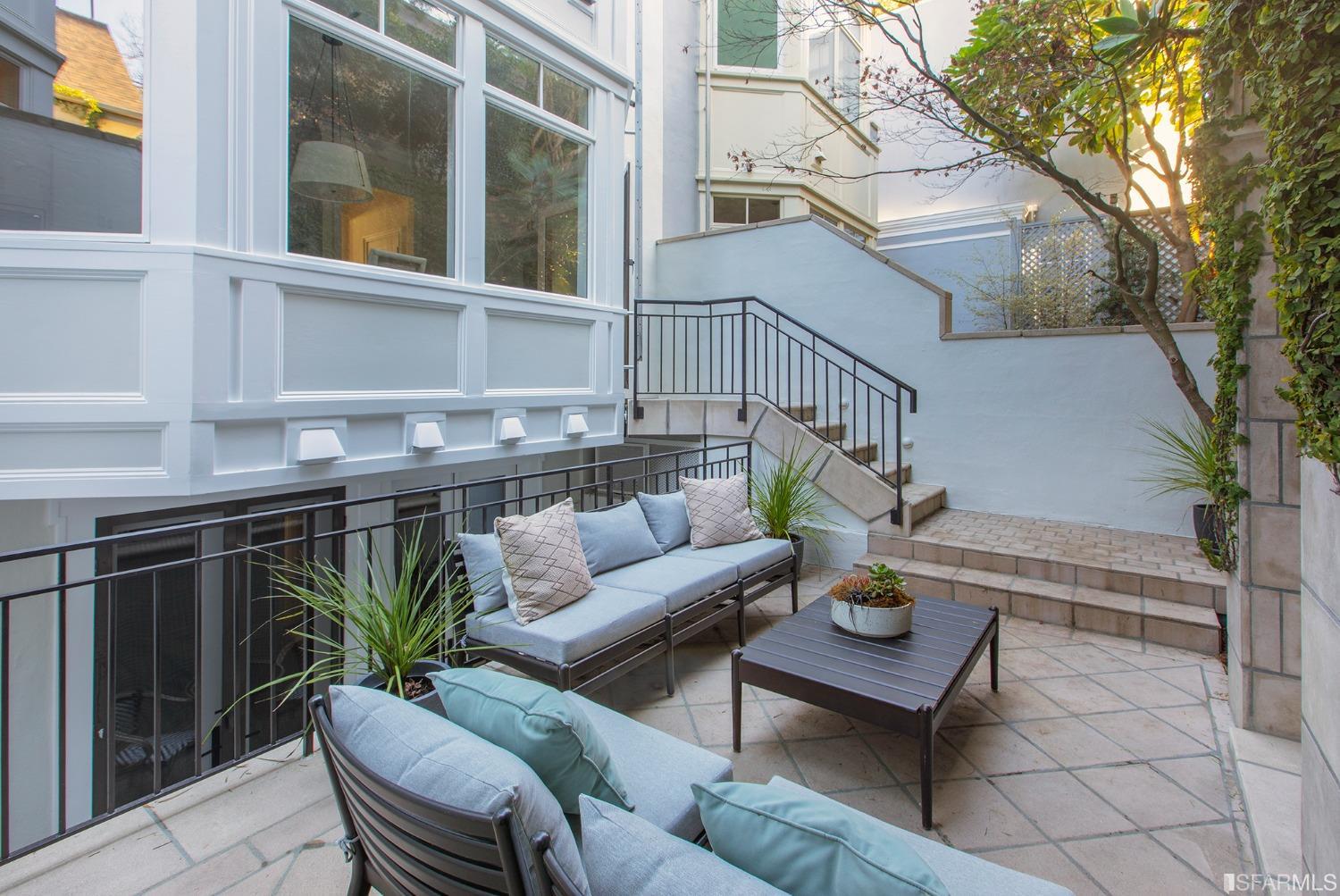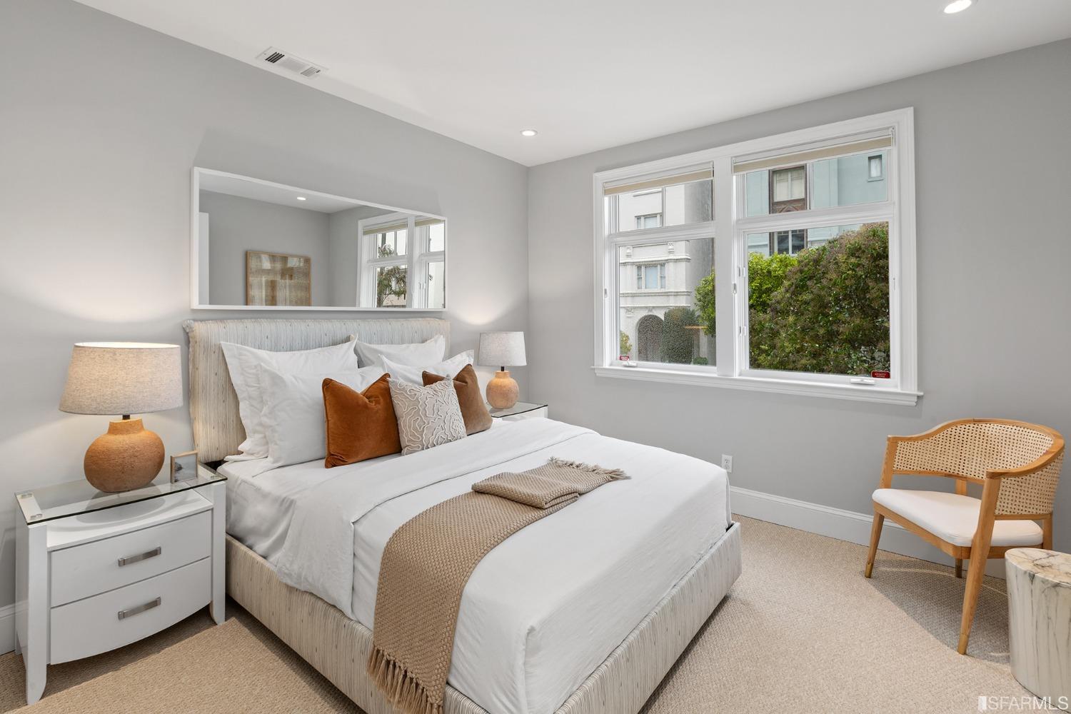 Video Preview! Northern edge of Pacific Heights, flat block close to Union St, built in 1997, 4 bed, 4 1/2 bath. Stone stairs lead from the sidewalk up to a private landing overlooking Vallejo. Four story home has living floor in the middle. Enter the foyer and up the stairs to the open living level with a dining room, wood burning fireplace and living room with bay windows. Powder room and updated kitchen are on the south side. Kitchen opens to the garden with an outdoor TV. Primary bedroom suite is on the top of the home facing north with French doors opening out to a Juliette balcony and a view of Alcatraz. The suite has built-in closets, a remodeled spacious bathroom with skylights. There is an en-suite bedroom on the south side. On the first living floor, there are two en-suite bedrooms and laundry. Rear bedroom opens to a patio. Internal stairs lead down to the mud room and a large two car garage with great storage.