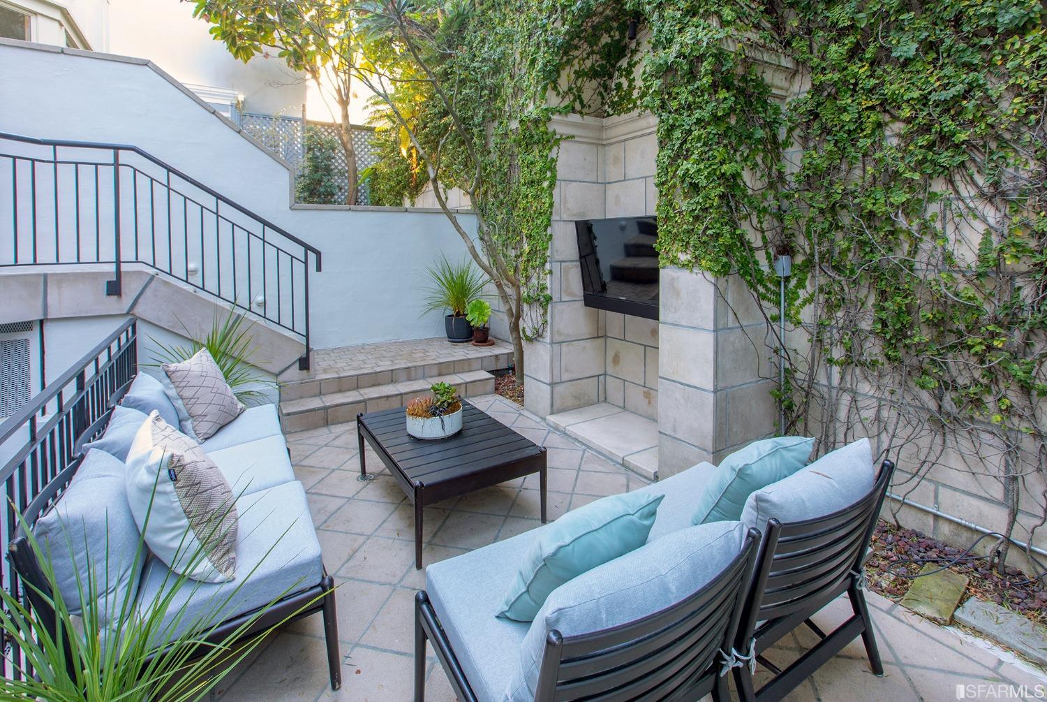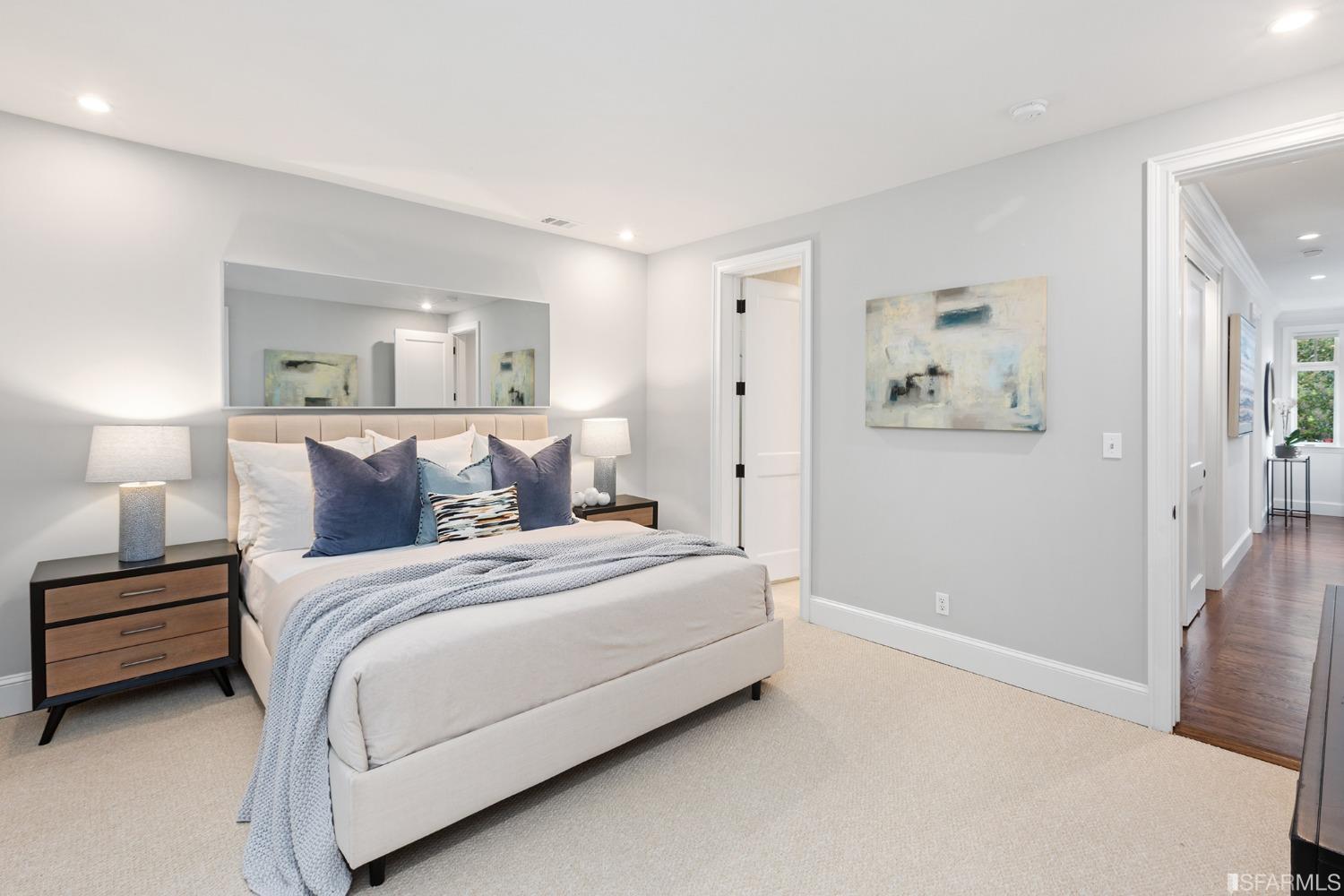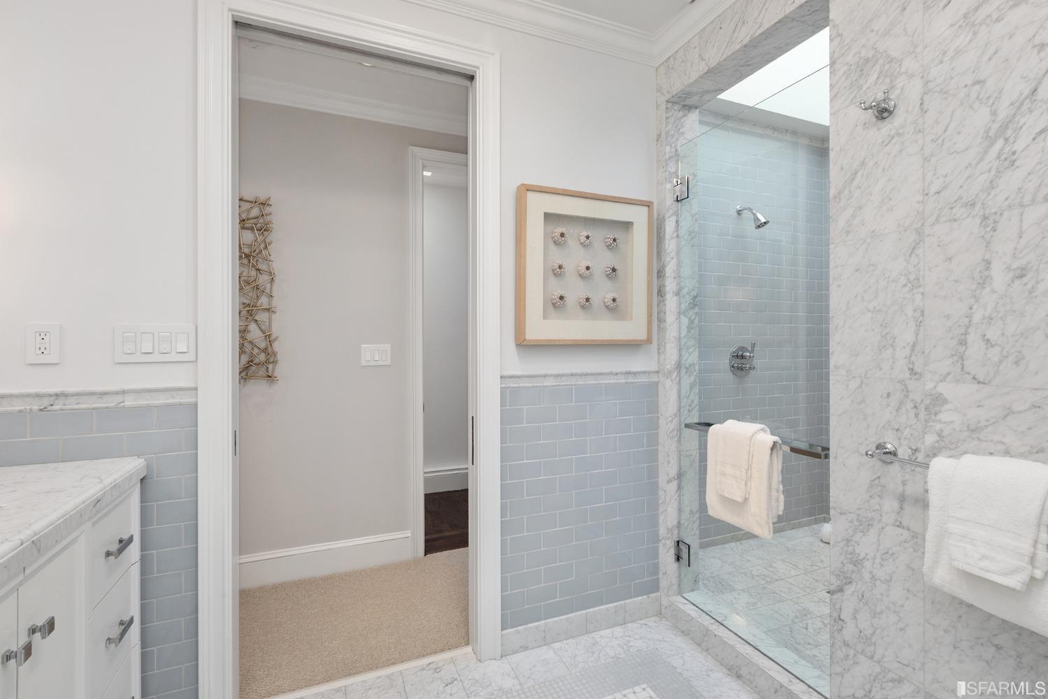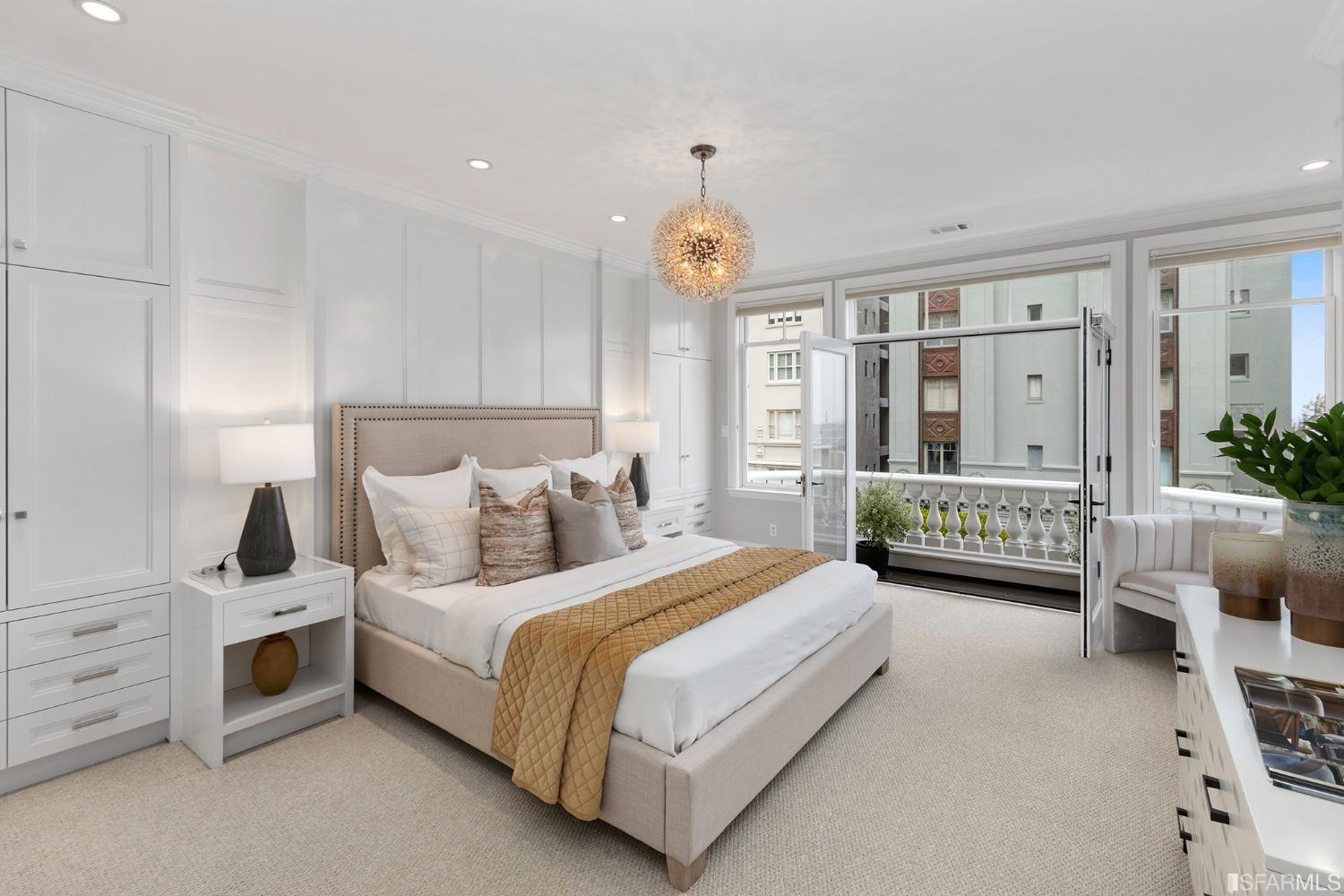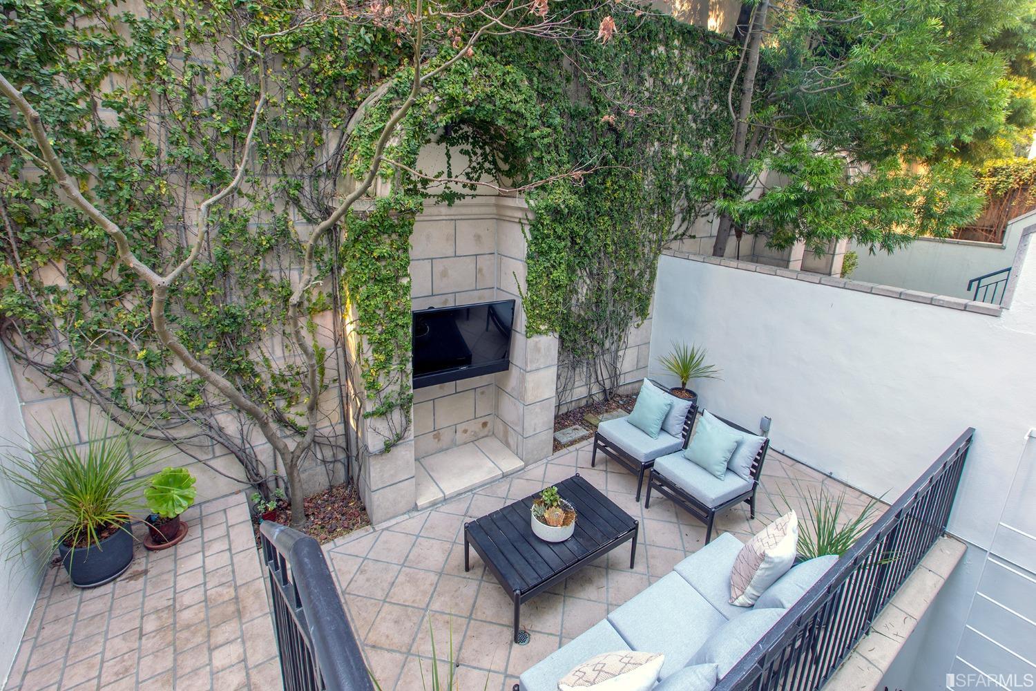 Video Preview! Northern edge of Pacific Heights, flat block close to Union St, built in 1997, 4 bed, 4 1/2 bath. Stone stairs lead from the sidewalk up to a private landing overlooking Vallejo. Four story home has living floor in the middle. Enter the foyer and up the stairs to the open living level with a dining room, wood burning fireplace and living room with bay windows. Powder room and updated kitchen are on the south side. Kitchen opens to the garden with an outdoor TV. Primary bedroom suite is on the top of the home facing north with French doors opening out to a Juliette balcony and a view of Alcatraz. The suite has built-in closets, a remodeled spacious bathroom with skylights. There is an en-suite bedroom on the south side. On the first living floor, there are two en-suite bedrooms and laundry. Rear bedroom opens to a patio. Internal stairs lead down to the mud room and a large two car garage with great storage.