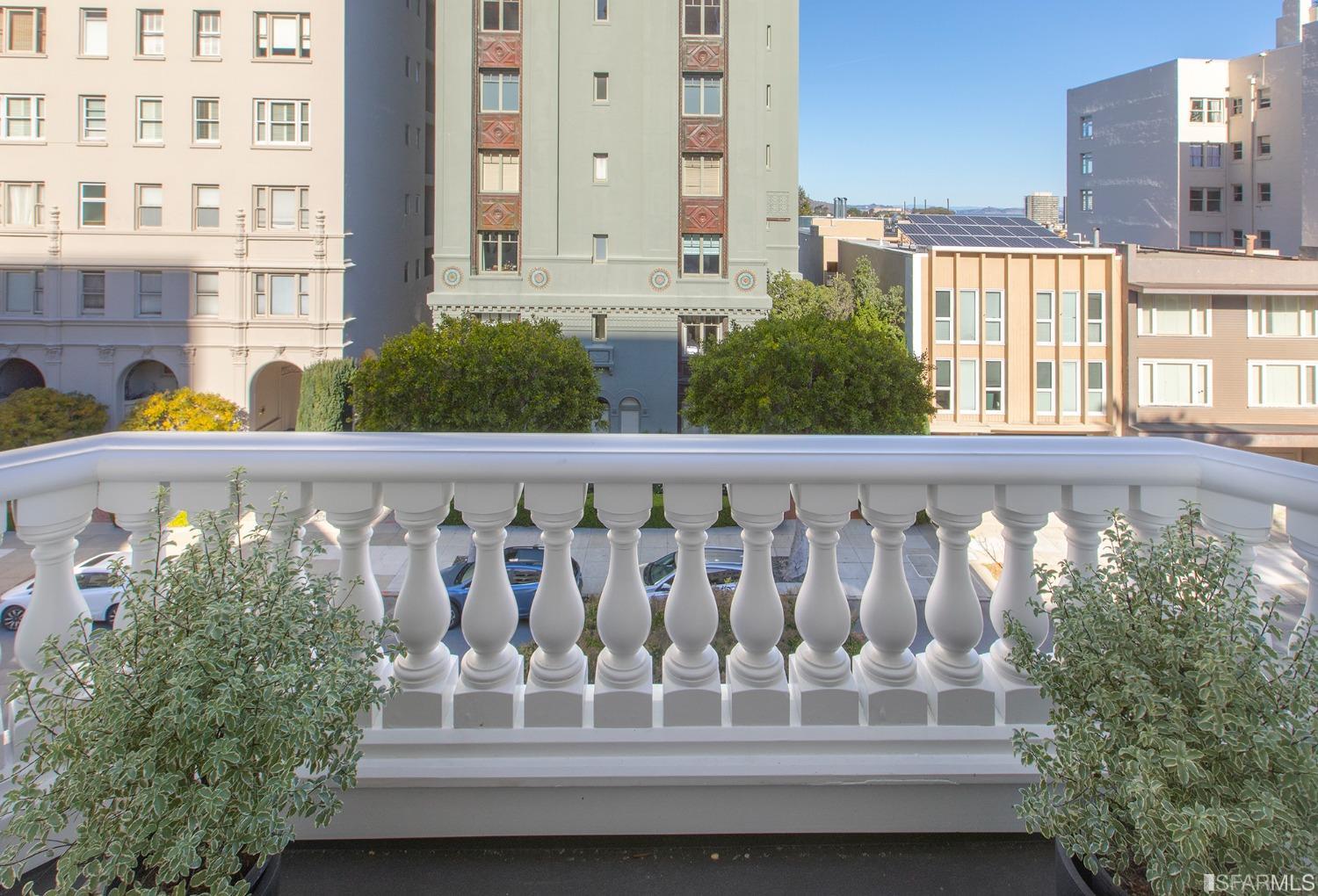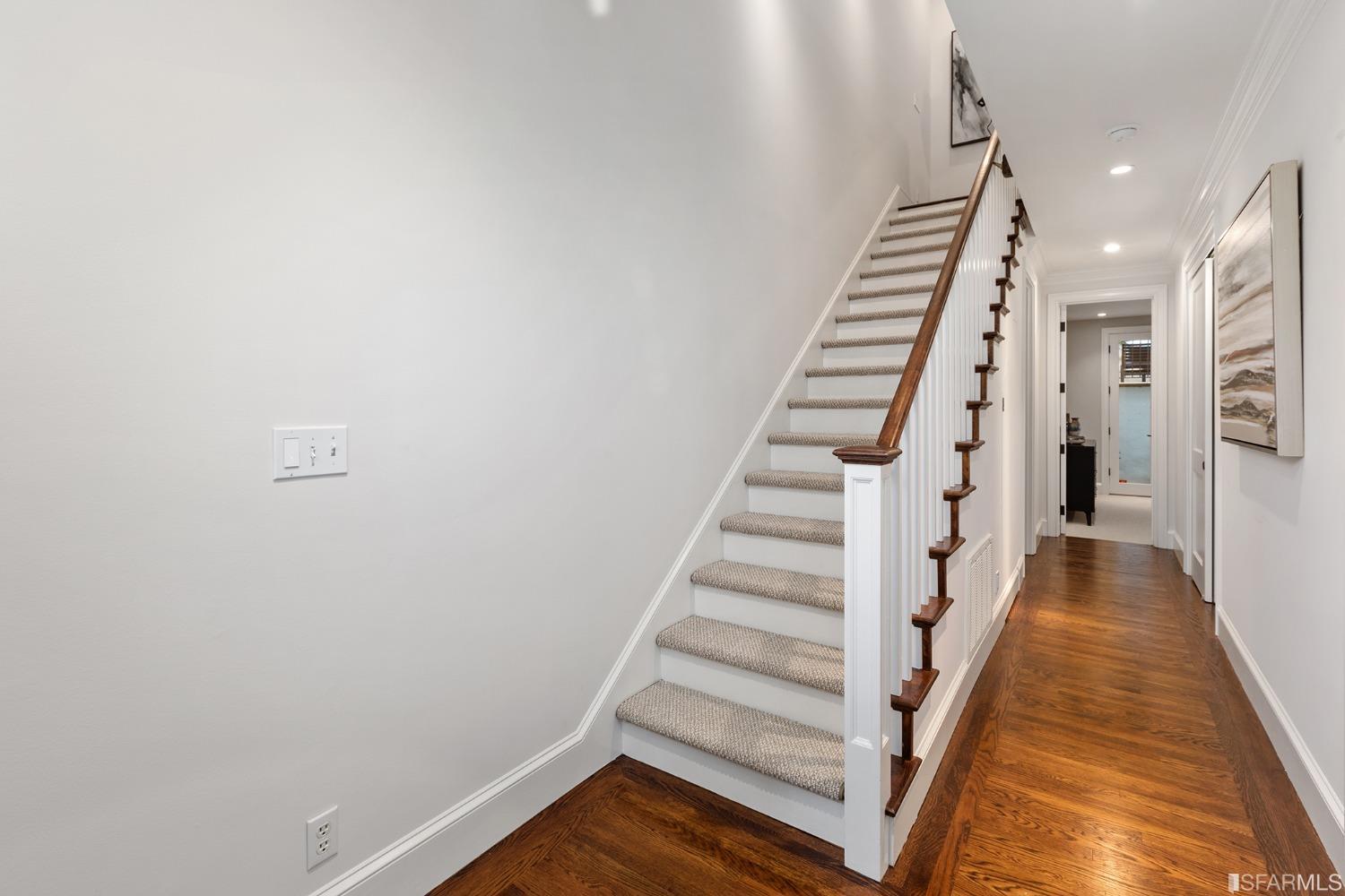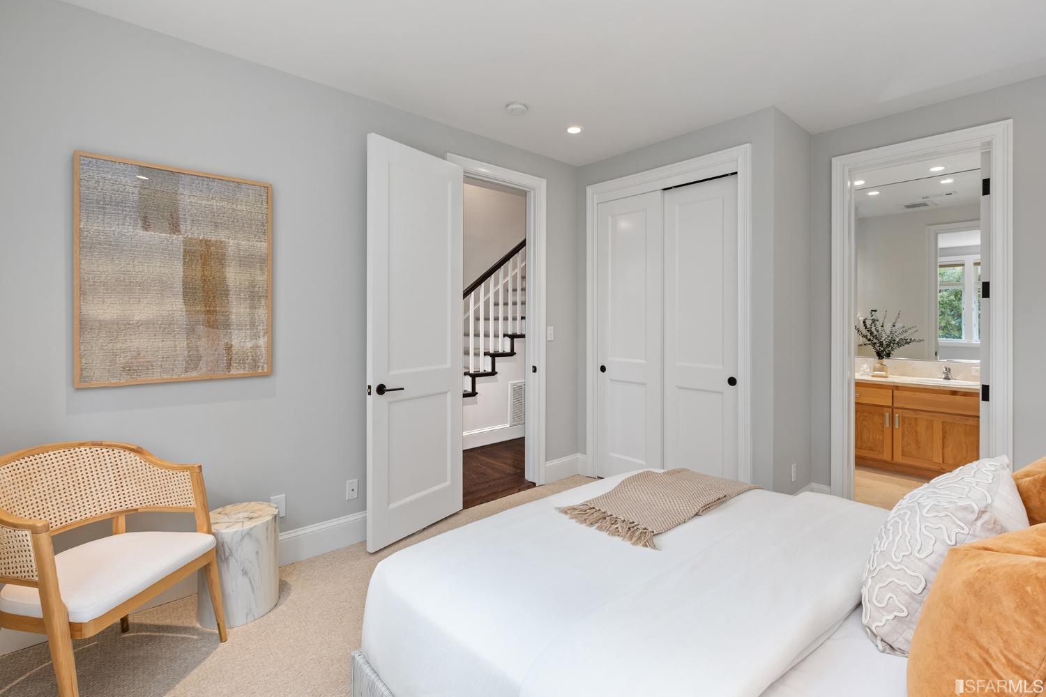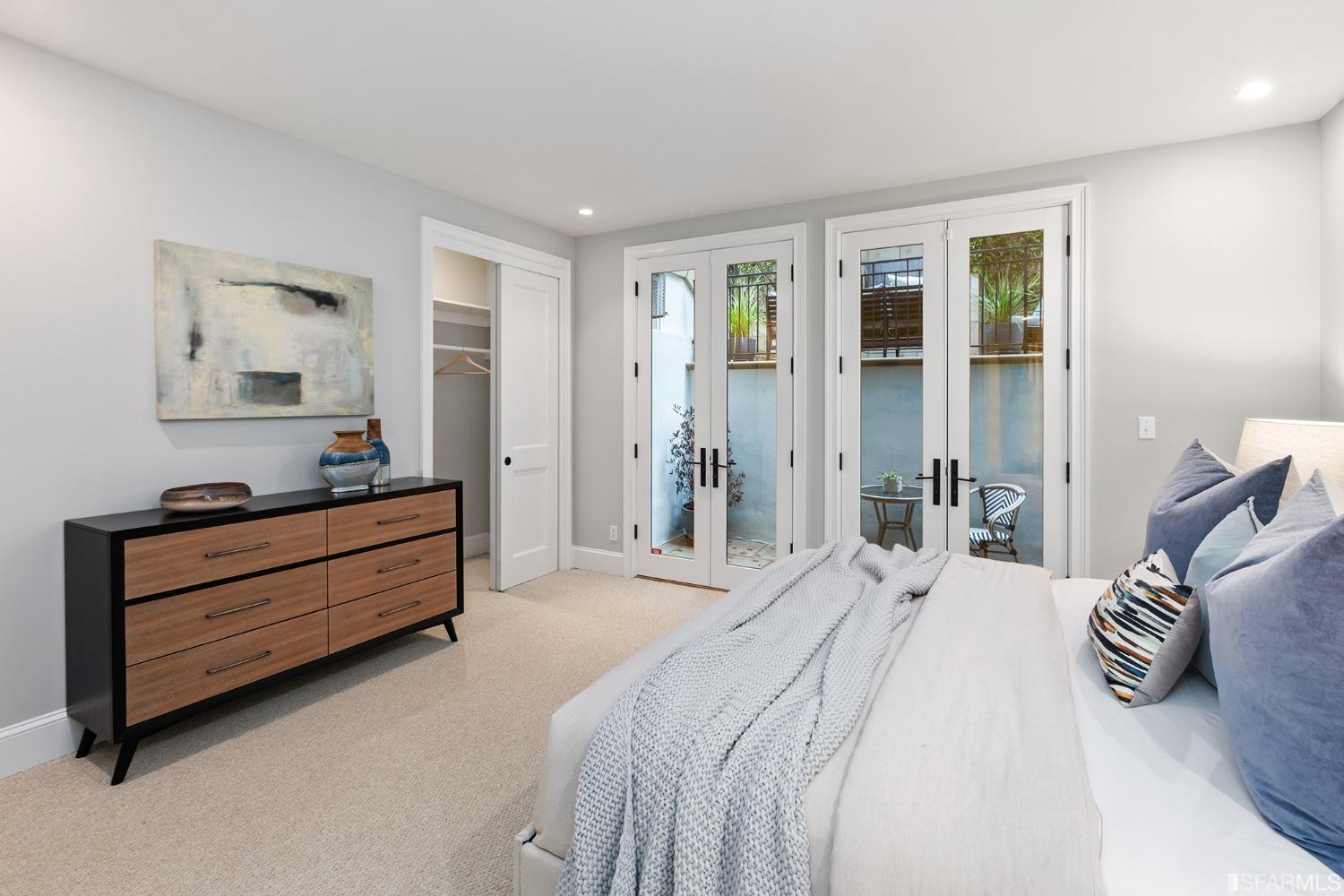 Video Preview! Northern edge of Pacific Heights, flat block close to Union St, built in 1997, 4 bed, 4 1/2 bath. Stone stairs lead from the sidewalk up to a private landing overlooking Vallejo. Four story home has living floor in the middle. Enter the foyer and up the stairs to the open living level with a dining room, wood burning fireplace and living room with bay windows. Powder room and updated kitchen are on the south side. Kitchen opens to the garden with an outdoor TV. Primary bedroom suite is on the top of the home facing north with French doors opening out to a Juliette balcony and a view of Alcatraz. The suite has built-in closets, a remodeled spacious bathroom with skylights. There is an en-suite bedroom on the south side. On the first living floor, there are two en-suite bedrooms and laundry. Rear bedroom opens to a patio. Internal stairs lead down to the mud room and a large two car garage with great storage.