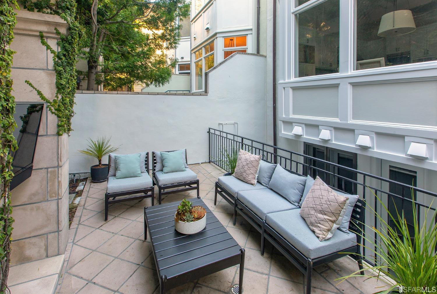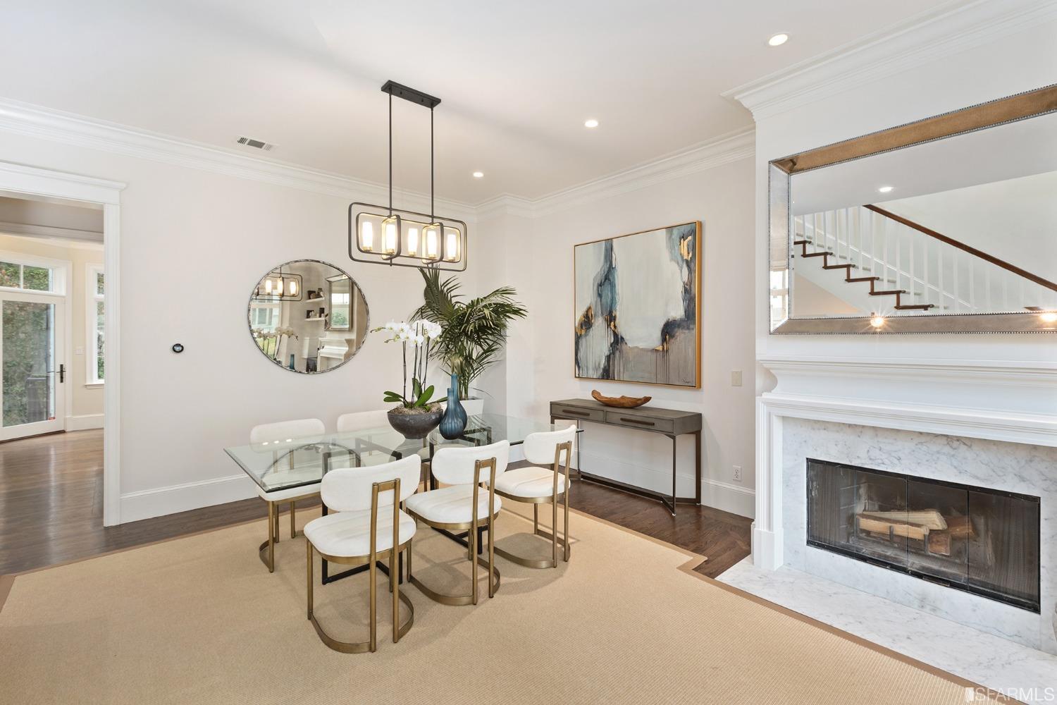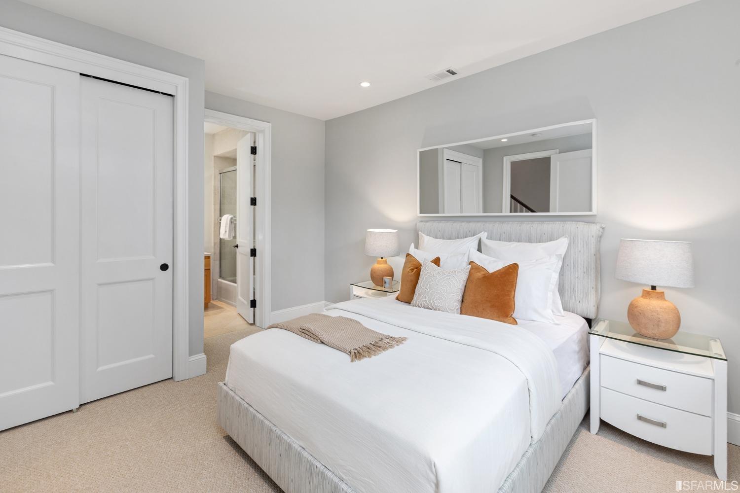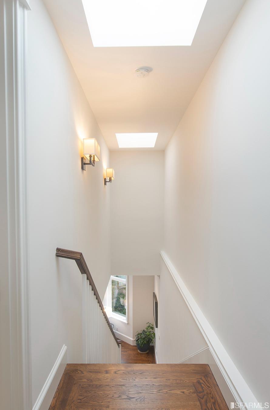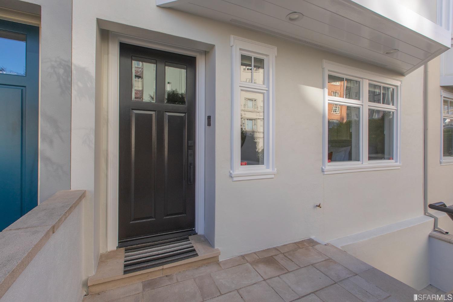 Video Preview! Northern edge of Pacific Heights, flat block close to Union St, built in 1997, 4 bed, 4 1/2 bath. Stone stairs lead from the sidewalk up to a private landing overlooking Vallejo. Four story home has living floor in the middle. Enter the foyer and up the stairs to the open living level with a dining room, wood burning fireplace and living room with bay windows. Powder room and updated kitchen are on the south side. Kitchen opens to the garden with an outdoor TV. Primary bedroom suite is on the top of the home facing north with French doors opening out to a Juliette balcony and a view of Alcatraz. The suite has built-in closets, a remodeled spacious bathroom with skylights. There is an en-suite bedroom on the south side. On the first living floor, there are two en-suite bedrooms and laundry. Rear bedroom opens to a patio. Internal stairs lead down to the mud room and a large two car garage with great storage.