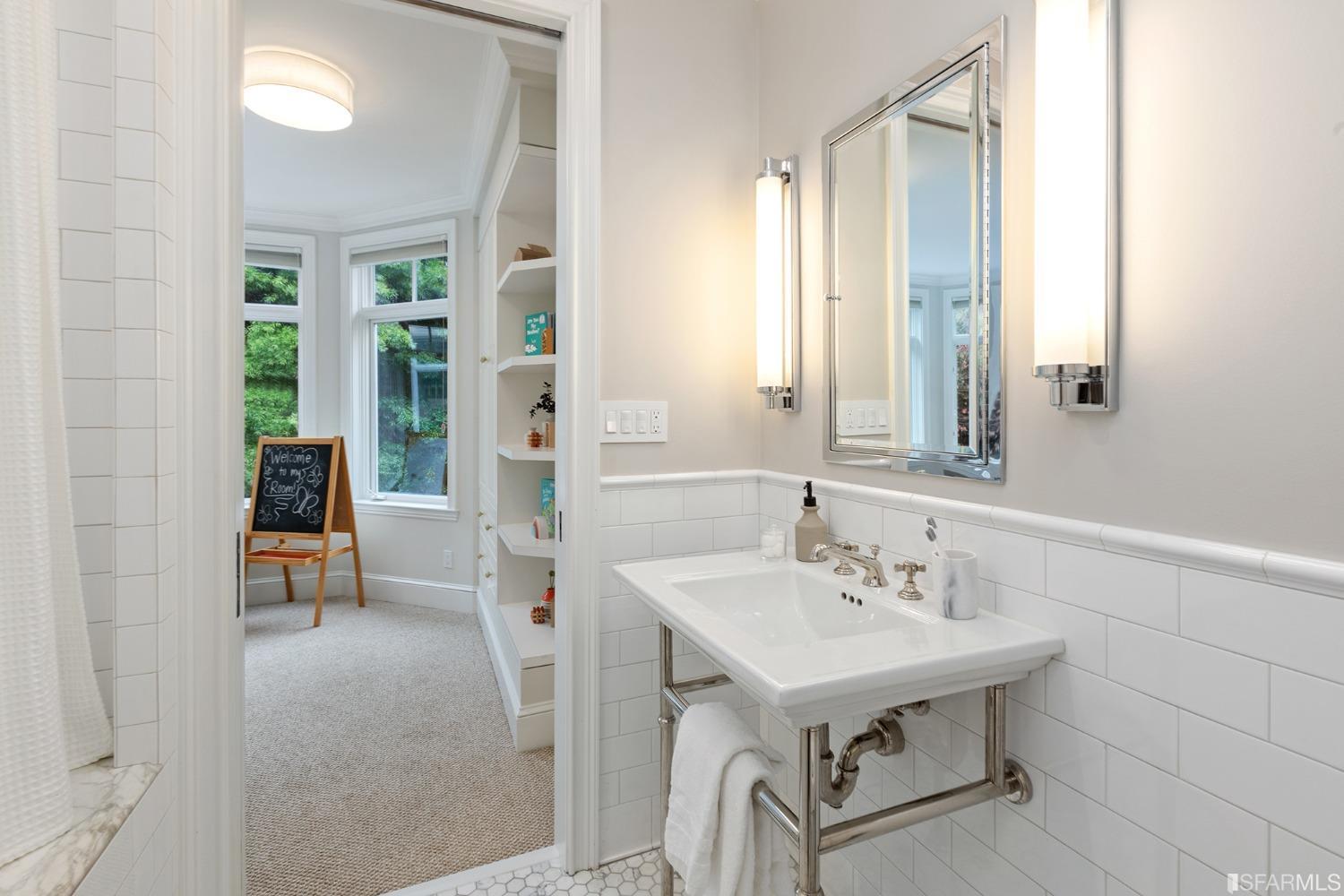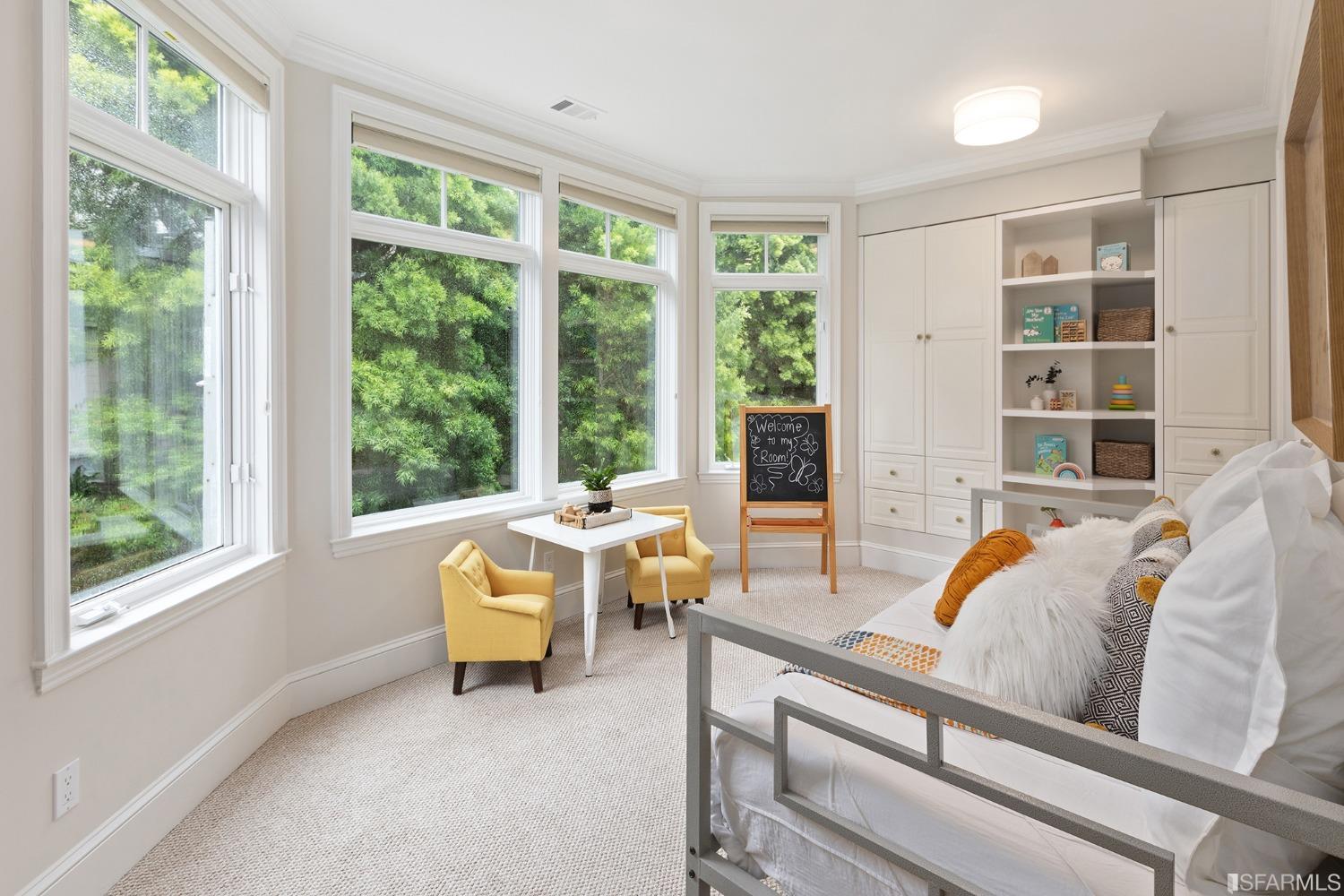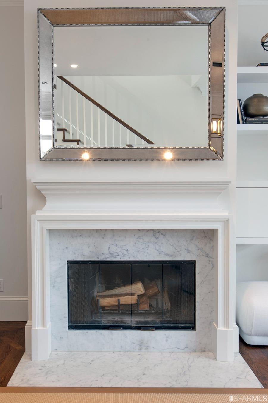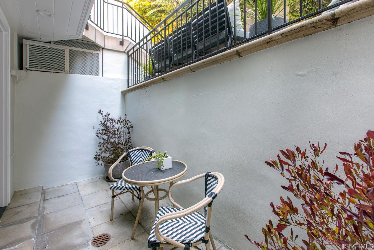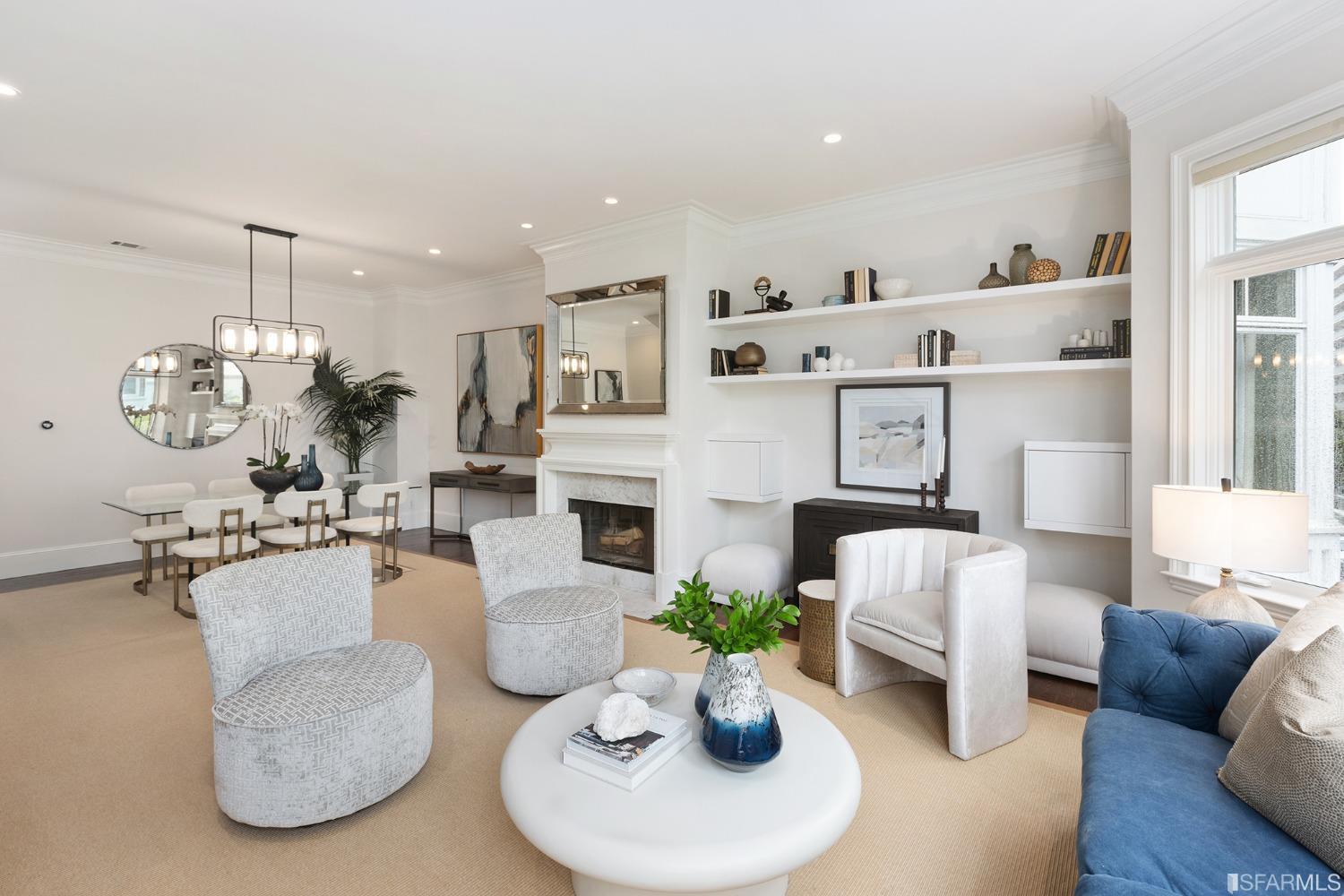 Video Preview! Northern edge of Pacific Heights, flat block close to Union St, built in 1997, 4 bed, 4 1/2 bath. Stone stairs lead from the sidewalk up to a private landing overlooking Vallejo. Four story home has living floor in the middle. Enter the foyer and up the stairs to the open living level with a dining room, wood burning fireplace and living room with bay windows. Powder room and updated kitchen are on the south side. Kitchen opens to the garden with an outdoor TV. Primary bedroom suite is on the top of the home facing north with French doors opening out to a Juliette balcony and a view of Alcatraz. The suite has built-in closets, a remodeled spacious bathroom with skylights. There is an en-suite bedroom on the south side. On the first living floor, there are two en-suite bedrooms and laundry. Rear bedroom opens to a patio. Internal stairs lead down to the mud room and a large two car garage with great storage.