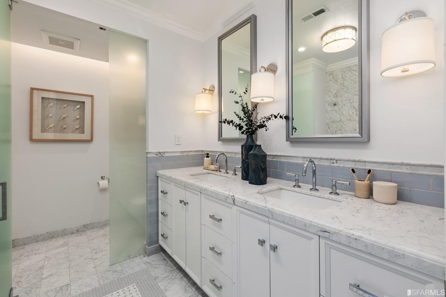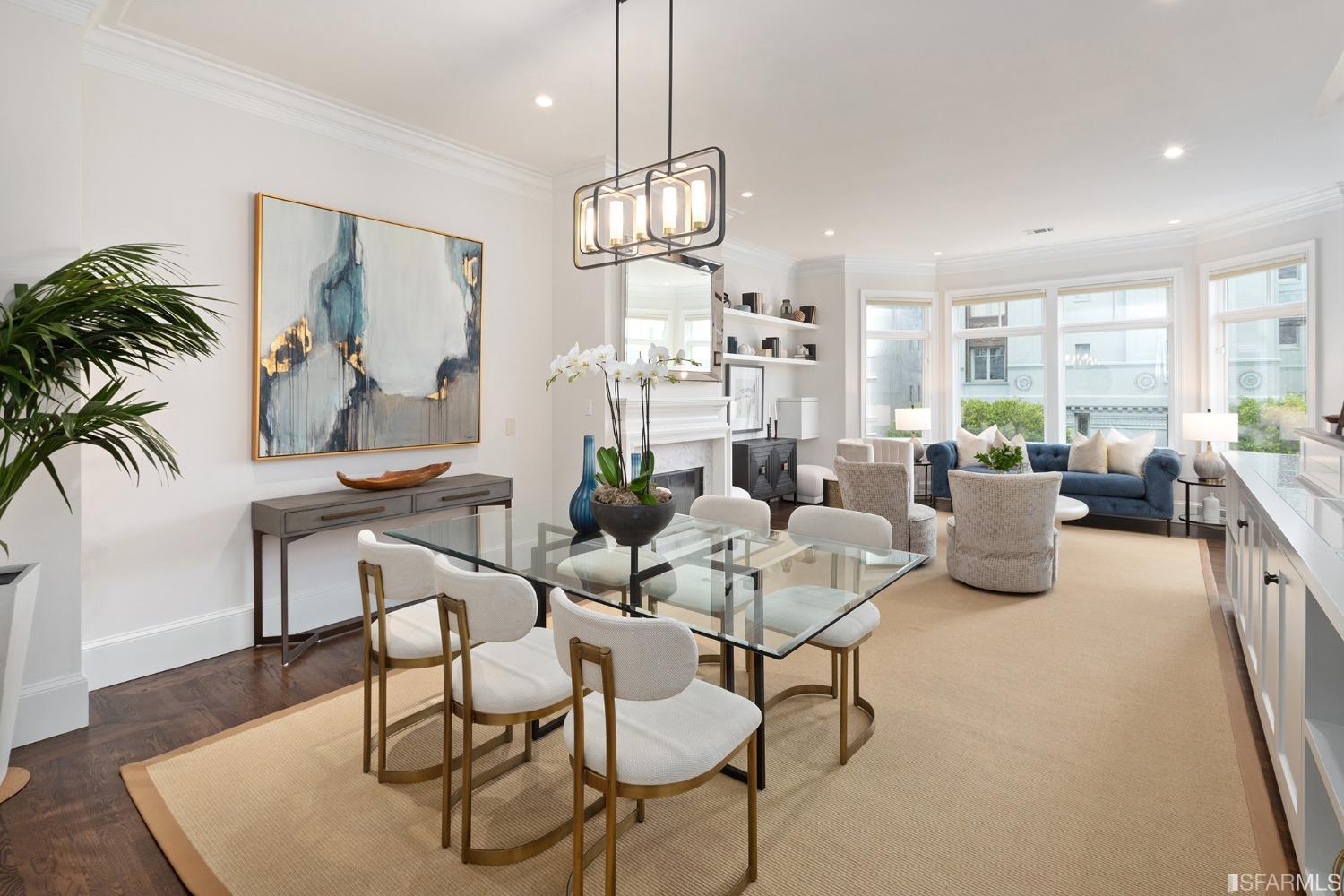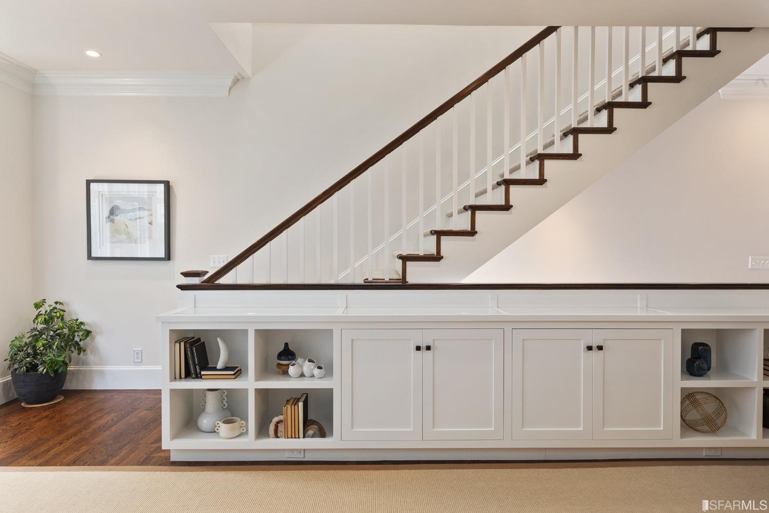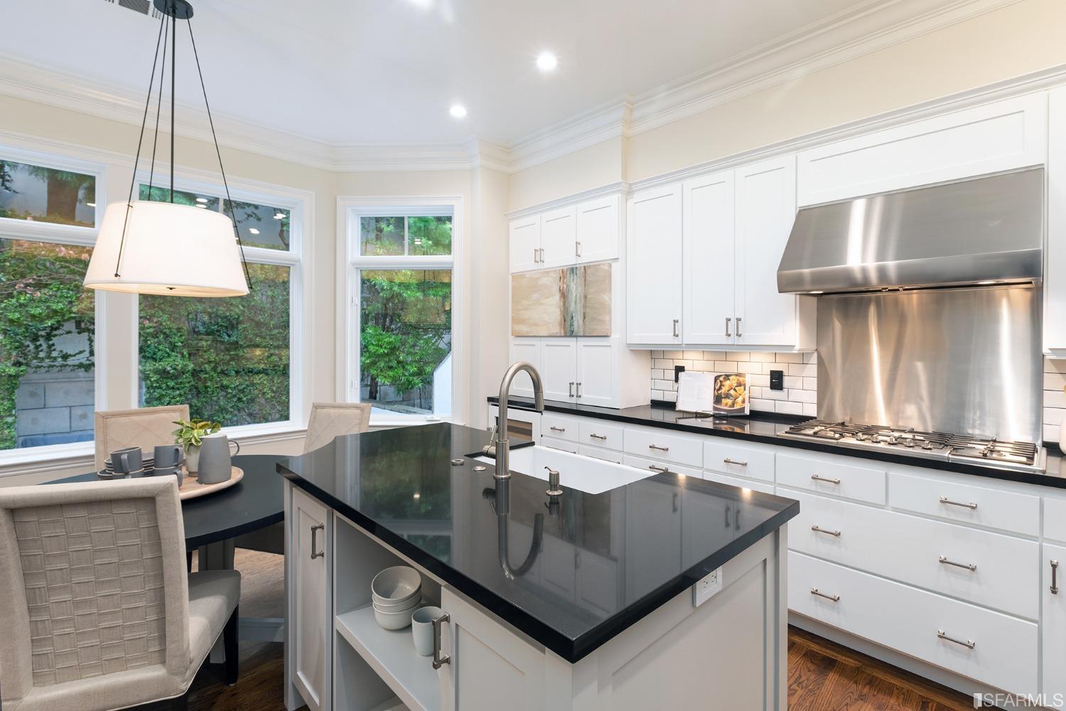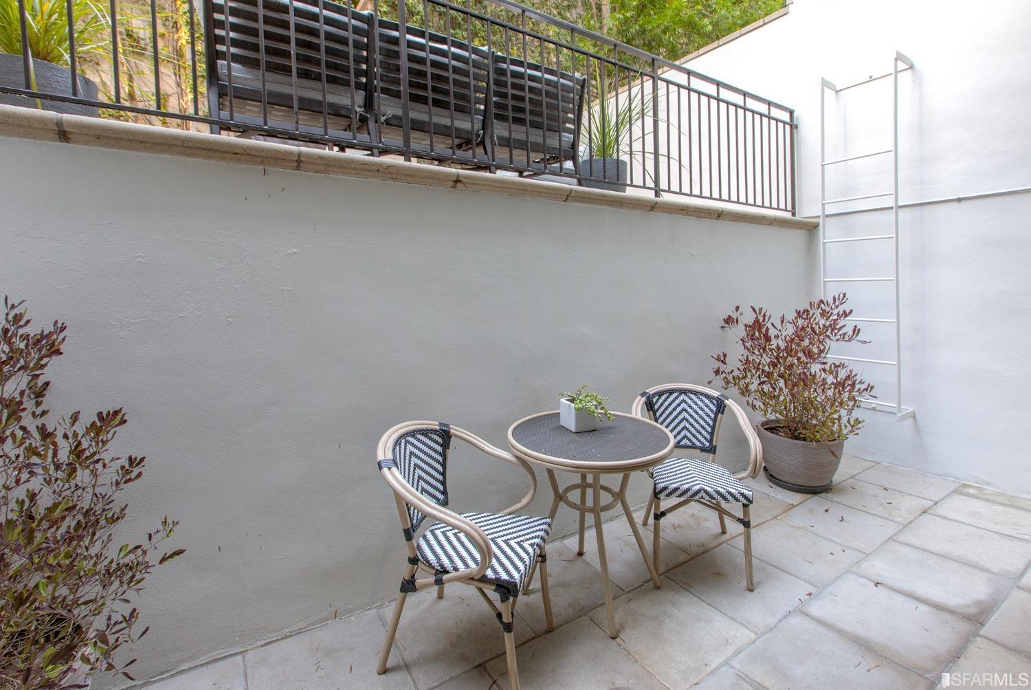 Video Preview! Northern edge of Pacific Heights, flat block close to Union St, built in 1997, 4 bed, 4 1/2 bath. Stone stairs lead from the sidewalk up to a private landing overlooking Vallejo. Four story home has living floor in the middle. Enter the foyer and up the stairs to the open living level with a dining room, wood burning fireplace and living room with bay windows. Powder room and updated kitchen are on the south side. Kitchen opens to the garden with an outdoor TV. Primary bedroom suite is on the top of the home facing north with French doors opening out to a Juliette balcony and a view of Alcatraz. The suite has built-in closets, a remodeled spacious bathroom with skylights. There is an en-suite bedroom on the south side. On the first living floor, there are two en-suite bedrooms and laundry. Rear bedroom opens to a patio. Internal stairs lead down to the mud room and a large two car garage with great storage.