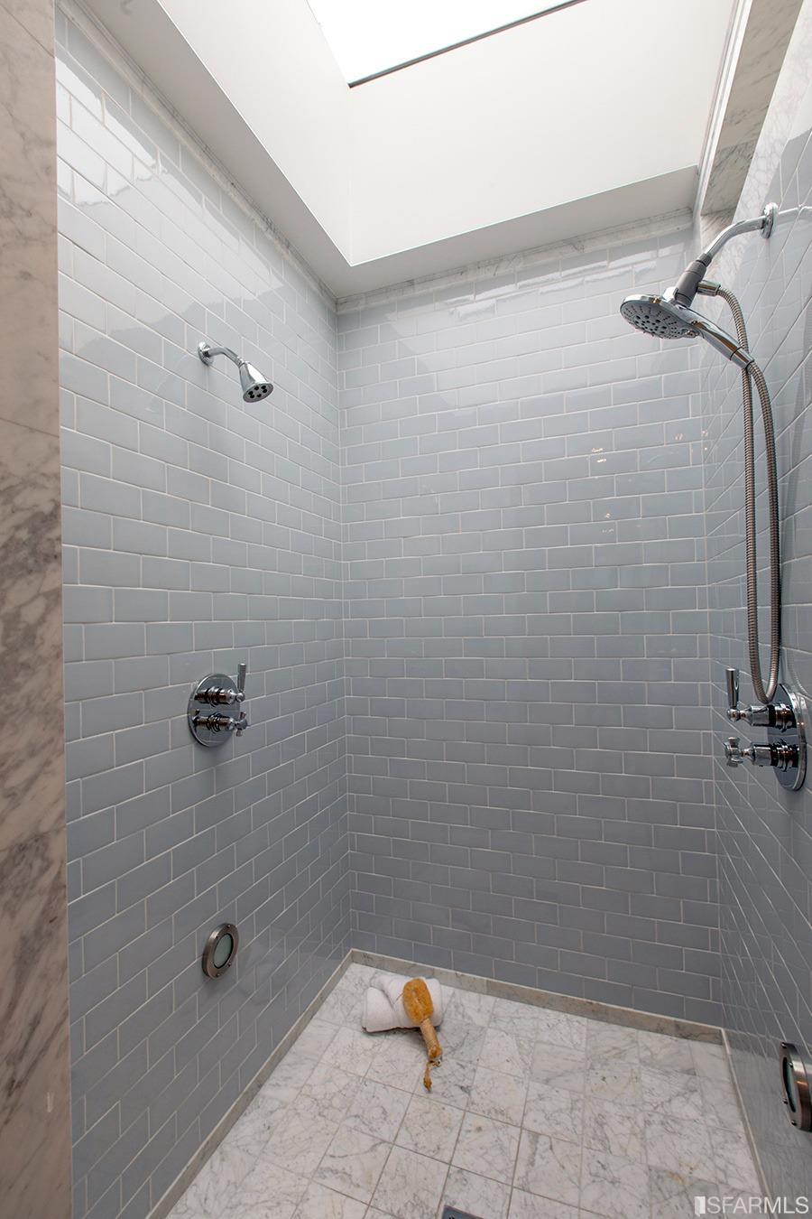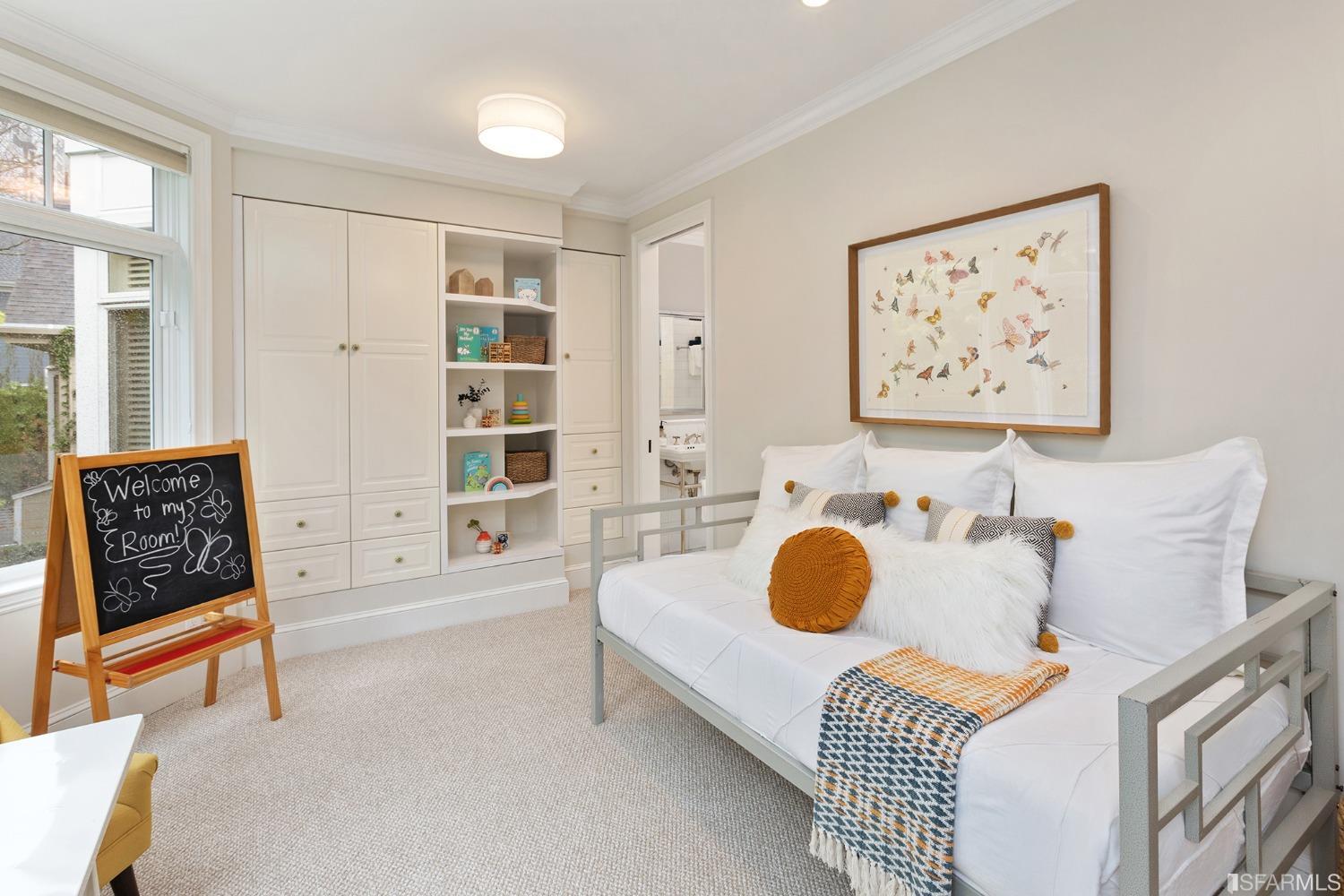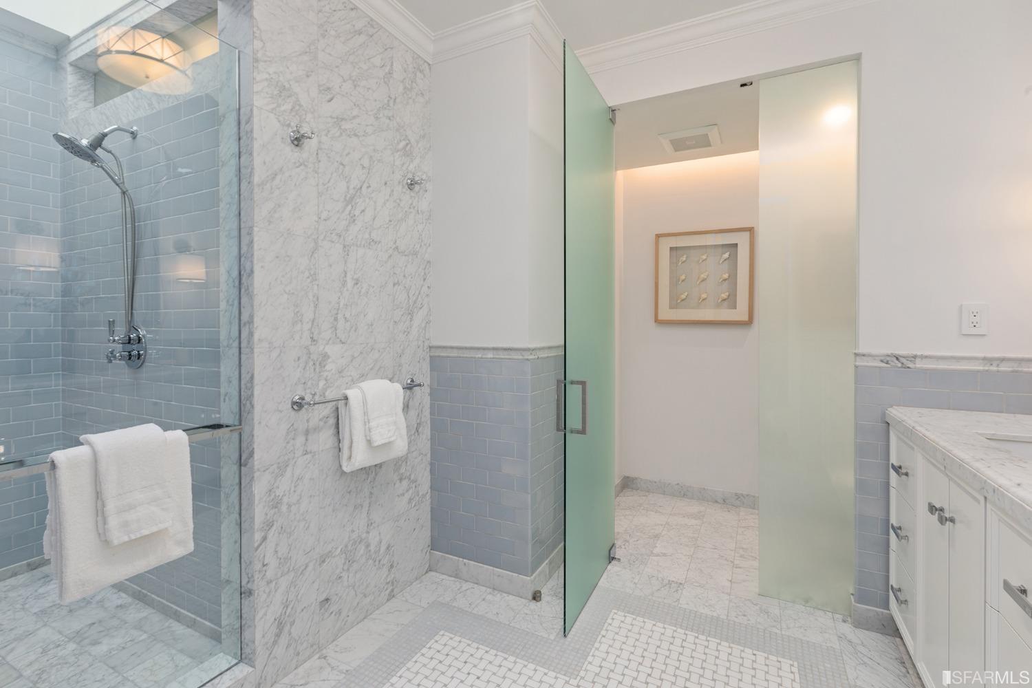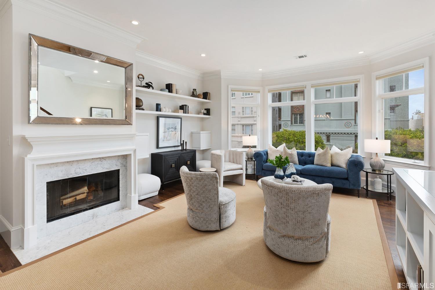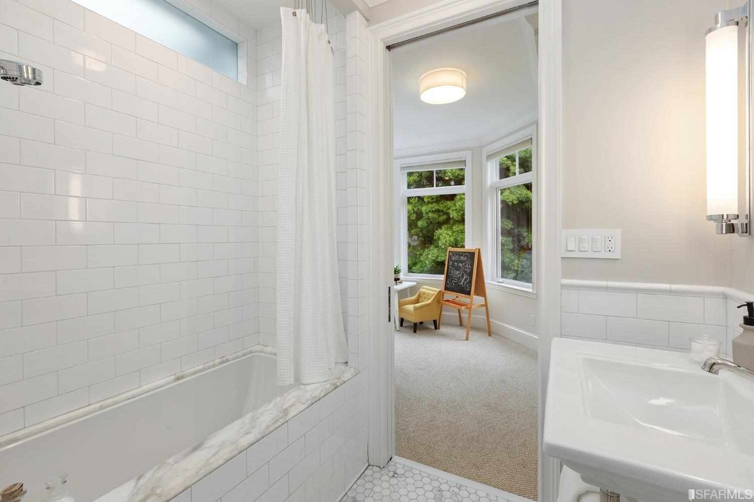 Video Preview! Northern edge of Pacific Heights, flat block close to Union St, built in 1997, 4 bed, 4 1/2 bath. Stone stairs lead from the sidewalk up to a private landing overlooking Vallejo. Four story home has living floor in the middle. Enter the foyer and up the stairs to the open living level with a dining room, wood burning fireplace and living room with bay windows. Powder room and updated kitchen are on the south side. Kitchen opens to the garden with an outdoor TV. Primary bedroom suite is on the top of the home facing north with French doors opening out to a Juliette balcony and a view of Alcatraz. The suite has built-in closets, a remodeled spacious bathroom with skylights. There is an en-suite bedroom on the south side. On the first living floor, there are two en-suite bedrooms and laundry. Rear bedroom opens to a patio. Internal stairs lead down to the mud room and a large two car garage with great storage.