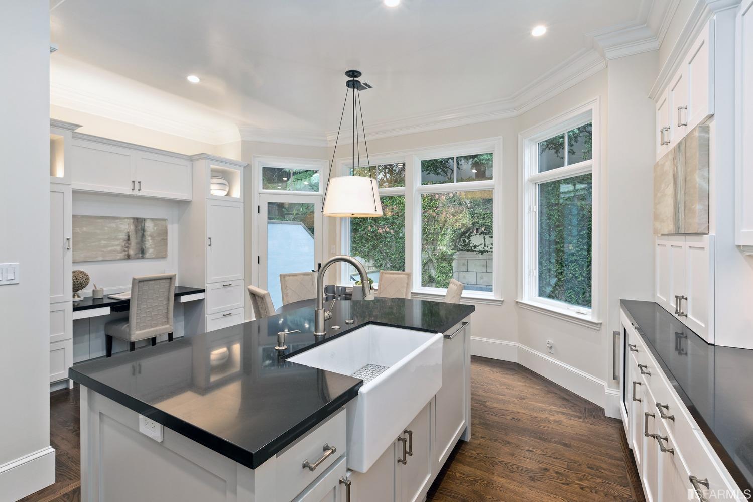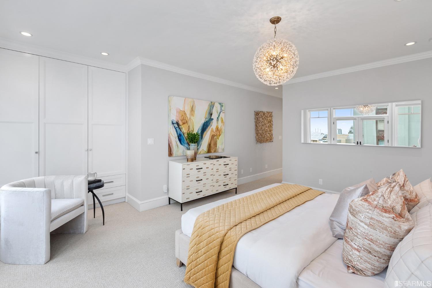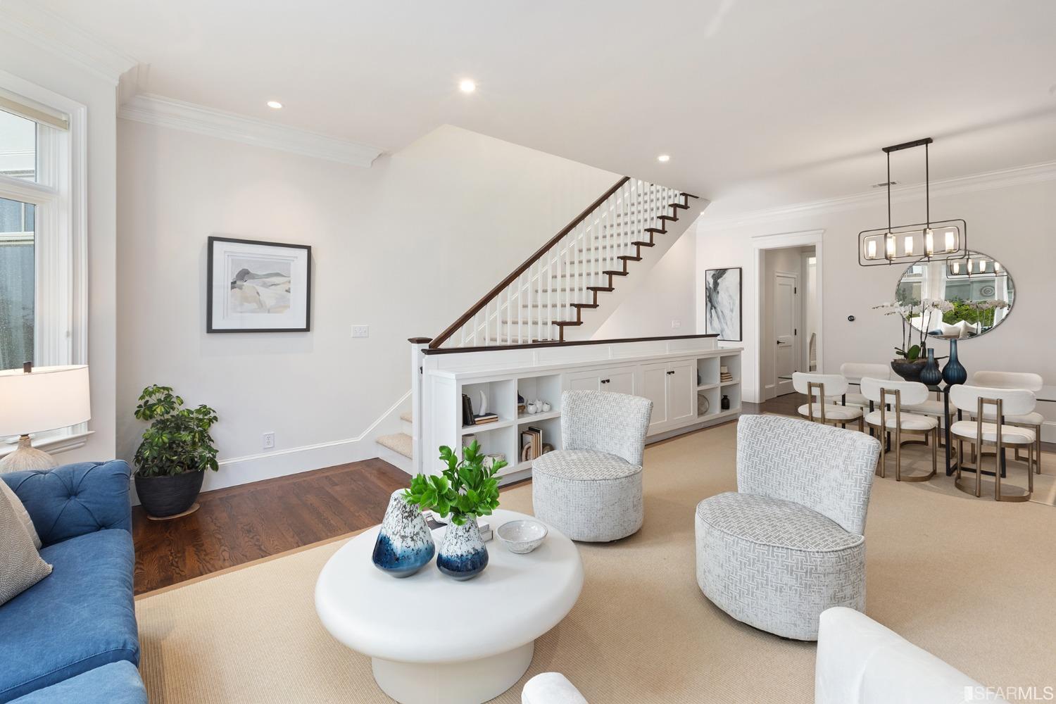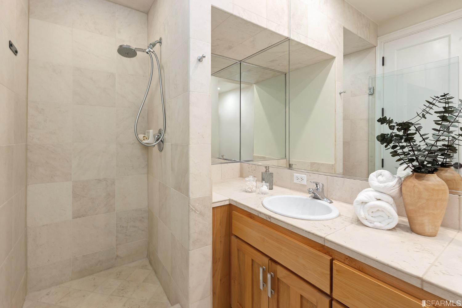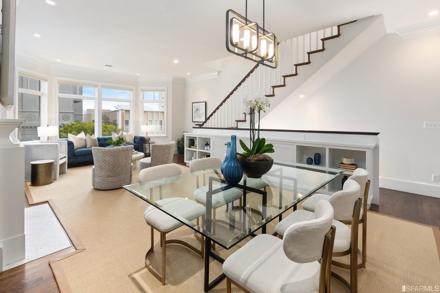 Video Preview! Northern edge of Pacific Heights, flat block close to Union St, built in 1997, 4 bed, 4 1/2 bath. Stone stairs lead from the sidewalk up to a private landing overlooking Vallejo. Four story home has living floor in the middle. Enter the foyer and up the stairs to the open living level with a dining room, wood burning fireplace and living room with bay windows. Powder room and updated kitchen are on the south side. Kitchen opens to the garden with an outdoor TV. Primary bedroom suite is on the top of the home facing north with French doors opening out to a Juliette balcony and a view of Alcatraz. The suite has built-in closets, a remodeled spacious bathroom with skylights. There is an en-suite bedroom on the south side. On the first living floor, there are two en-suite bedrooms and laundry. Rear bedroom opens to a patio. Internal stairs lead down to the mud room and a large two car garage with great storage.