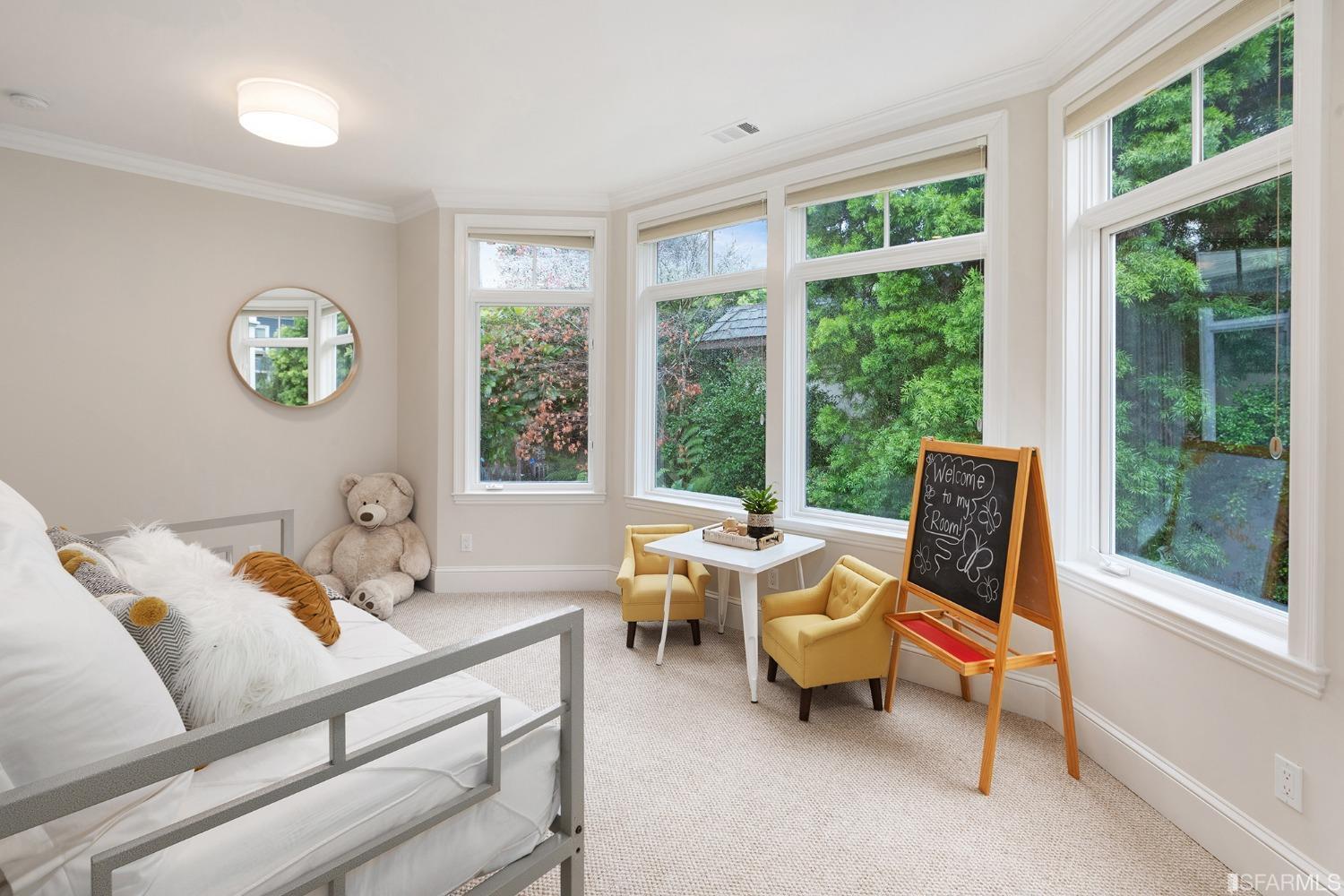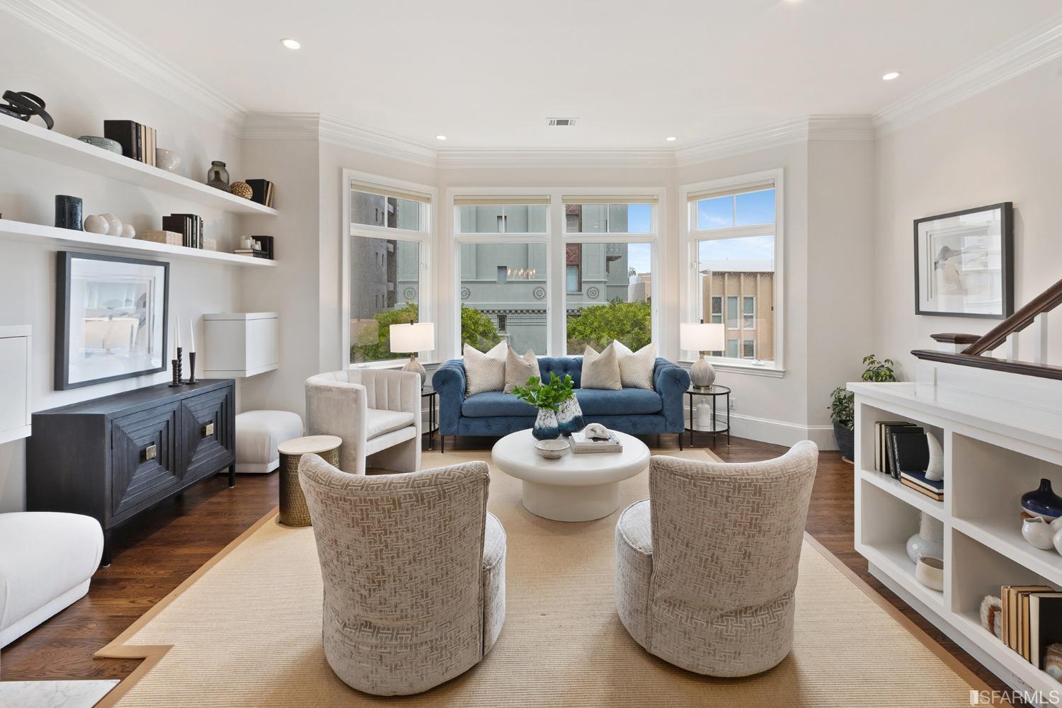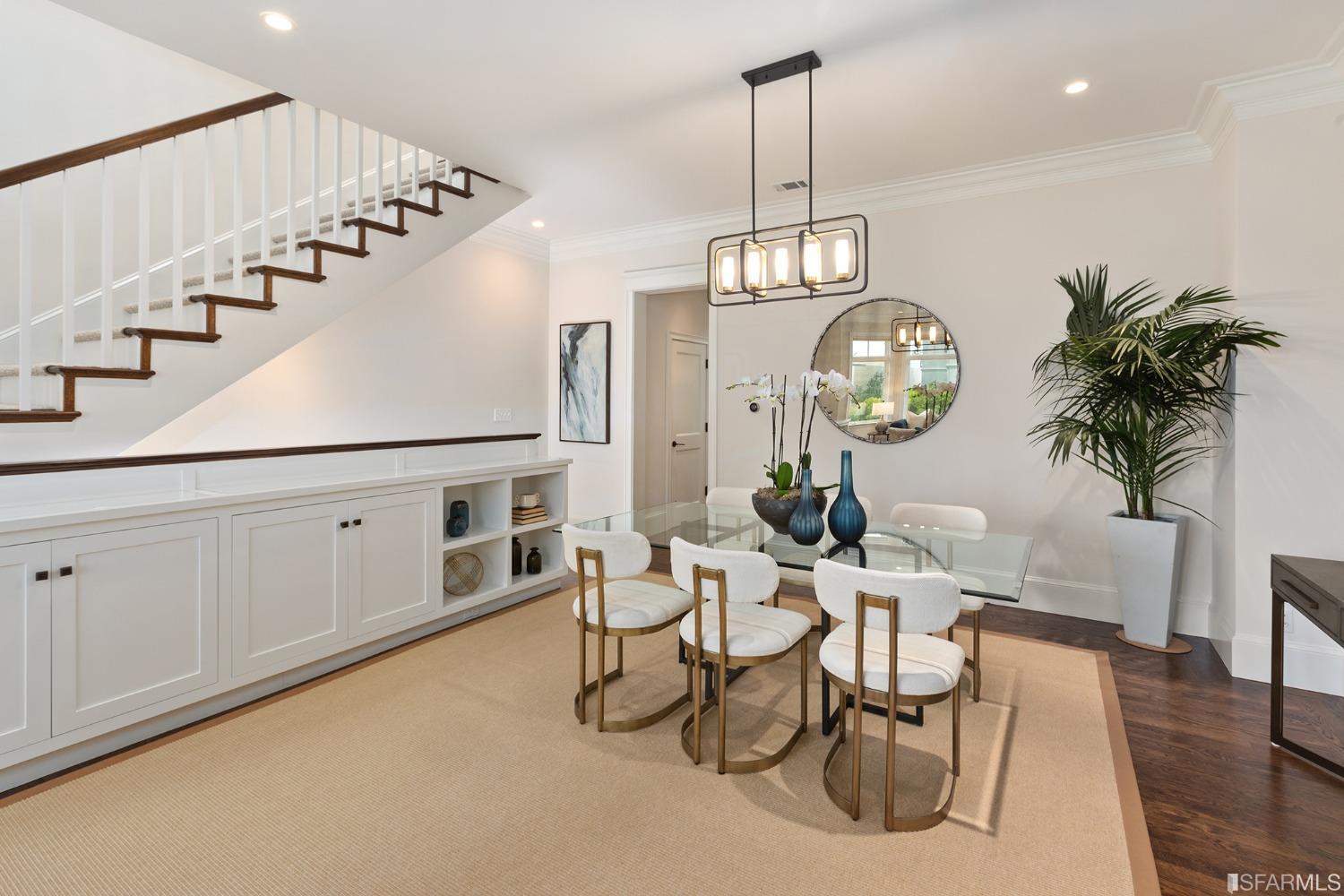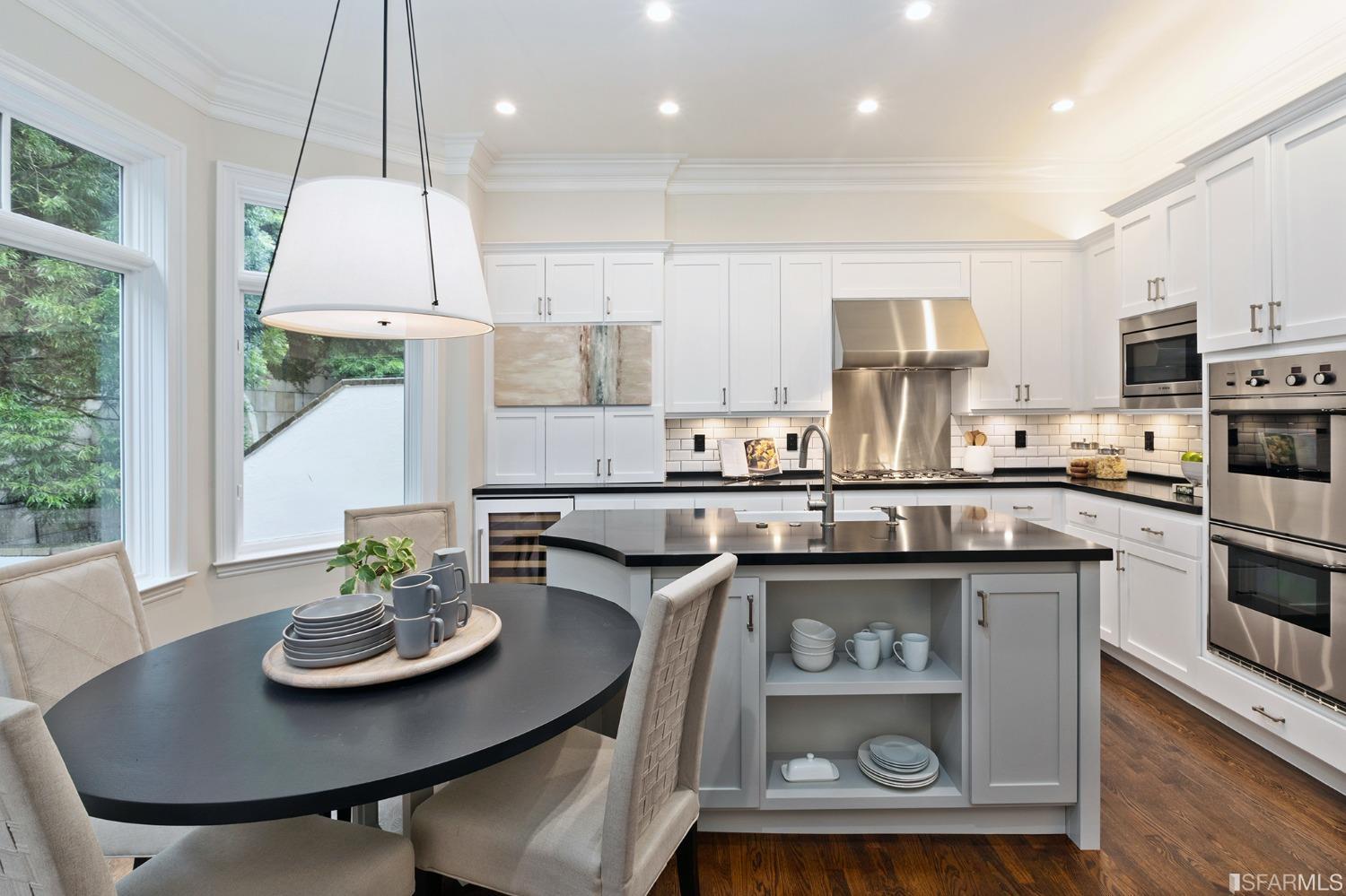 Video Preview! Northern edge of Pacific Heights, flat block close to Union St, built in 1997, 4 bed, 4 1/2 bath. Stone stairs lead from the sidewalk up to a private landing overlooking Vallejo. Four story home has living floor in the middle. Enter the foyer and up the stairs to the open living level with a dining room, wood burning fireplace and living room with bay windows. Powder room and updated kitchen are on the south side. Kitchen opens to the garden with an outdoor TV. Primary bedroom suite is on the top of the home facing north with French doors opening out to a Juliette balcony and a view of Alcatraz. The suite has built-in closets, a remodeled spacious bathroom with skylights. There is an en-suite bedroom on the south side. On the first living floor, there are two en-suite bedrooms and laundry. Rear bedroom opens to a patio. Internal stairs lead down to the mud room and a large two car garage with great storage.