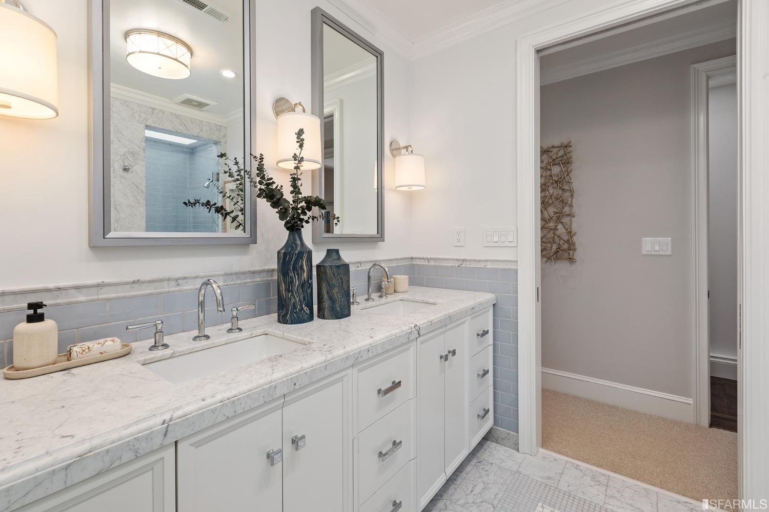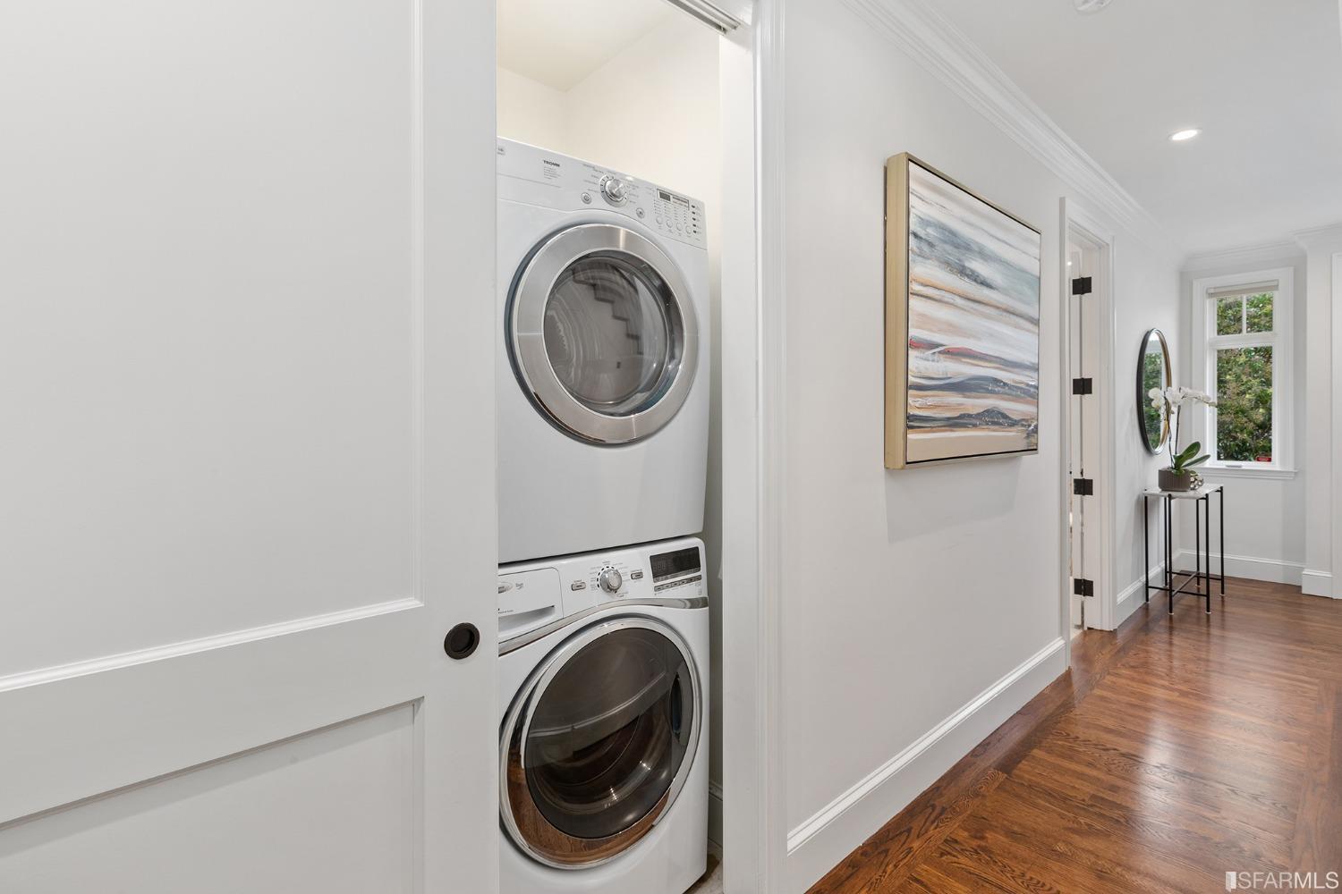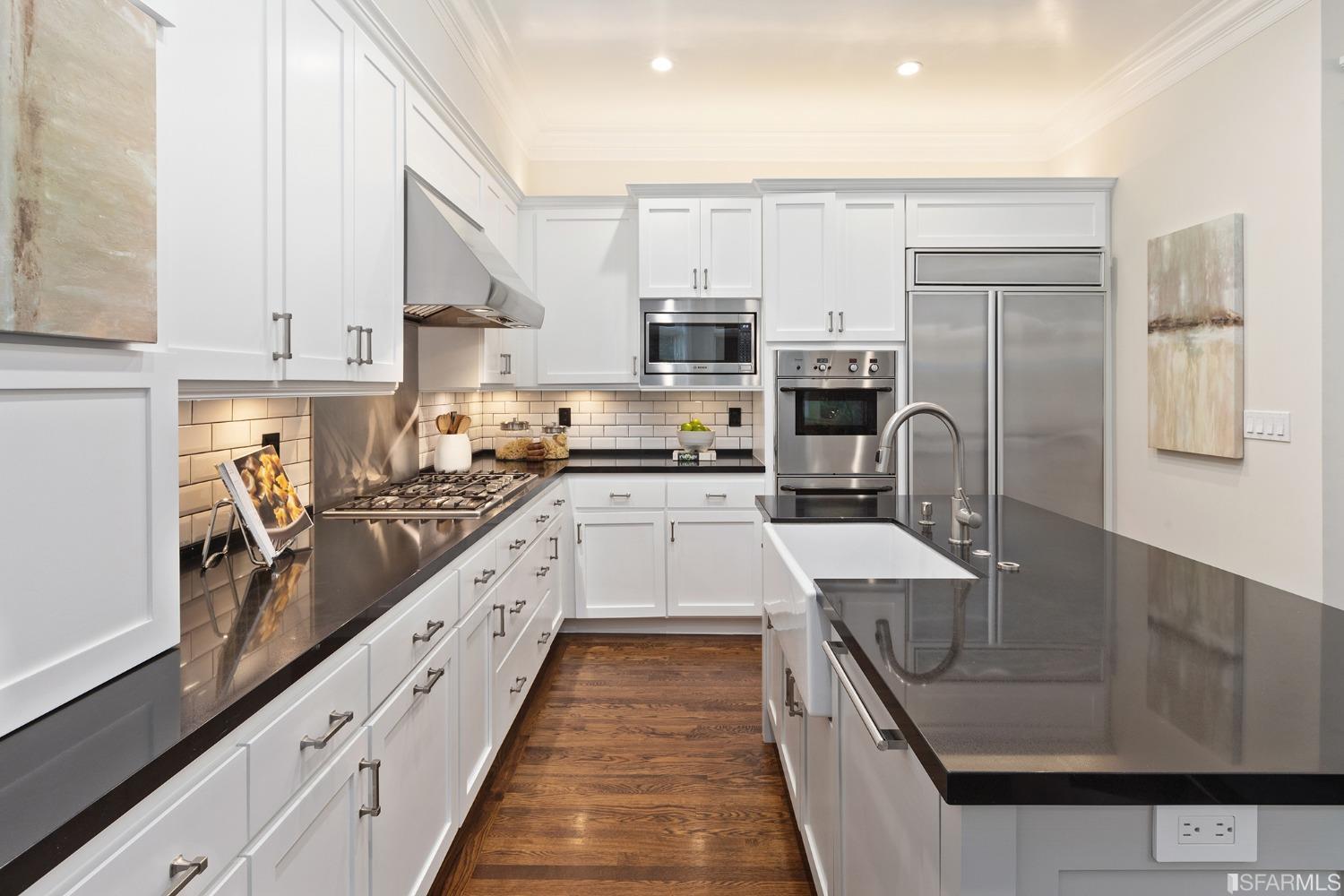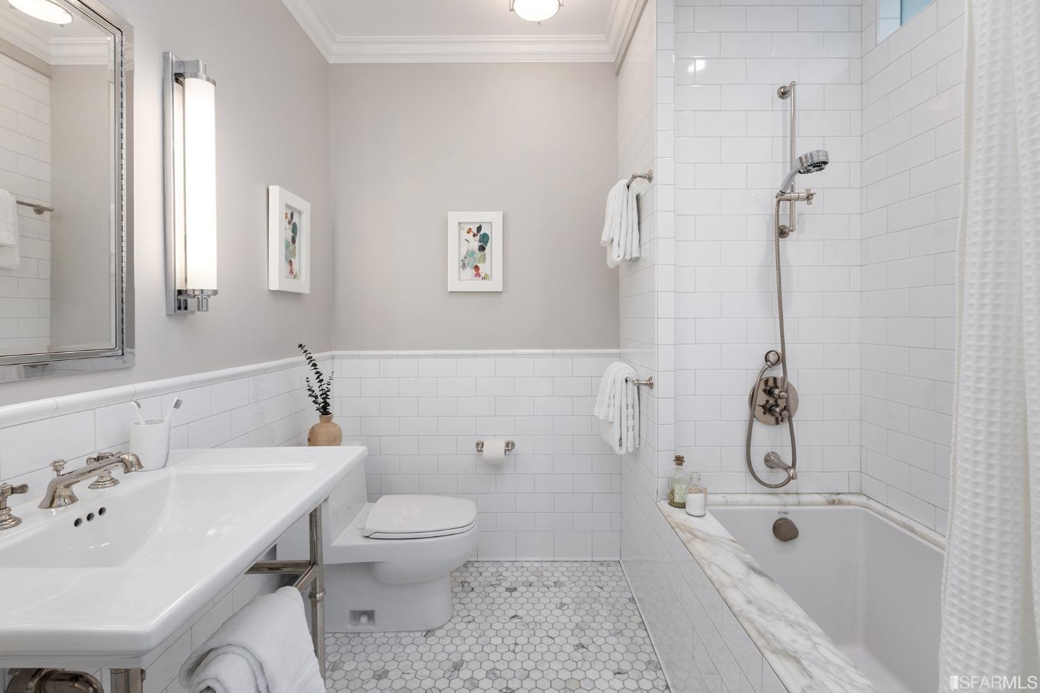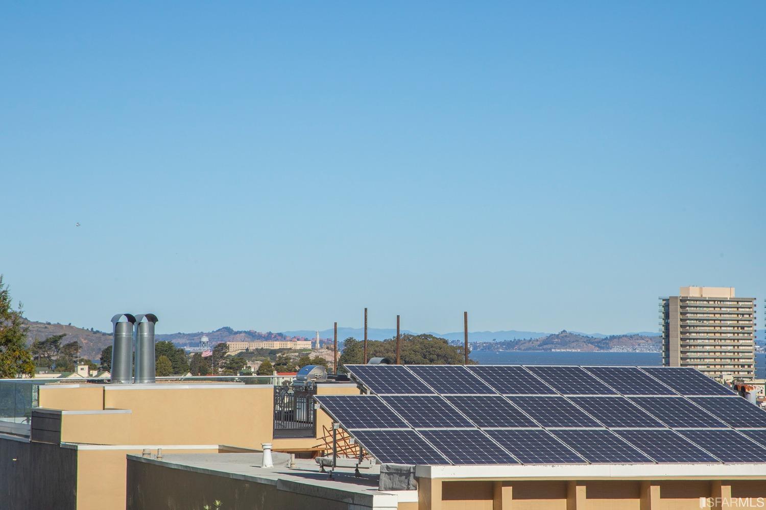 Video Preview! Northern edge of Pacific Heights, flat block close to Union St, built in 1997, 4 bed, 4 1/2 bath. Stone stairs lead from the sidewalk up to a private landing overlooking Vallejo. Four story home has living floor in the middle. Enter the foyer and up the stairs to the open living level with a dining room, wood burning fireplace and living room with bay windows. Powder room and updated kitchen are on the south side. Kitchen opens to the garden with an outdoor TV. Primary bedroom suite is on the top of the home facing north with French doors opening out to a Juliette balcony and a view of Alcatraz. The suite has built-in closets, a remodeled spacious bathroom with skylights. There is an en-suite bedroom on the south side. On the first living floor, there are two en-suite bedrooms and laundry. Rear bedroom opens to a patio. Internal stairs lead down to the mud room and a large two car garage with great storage.