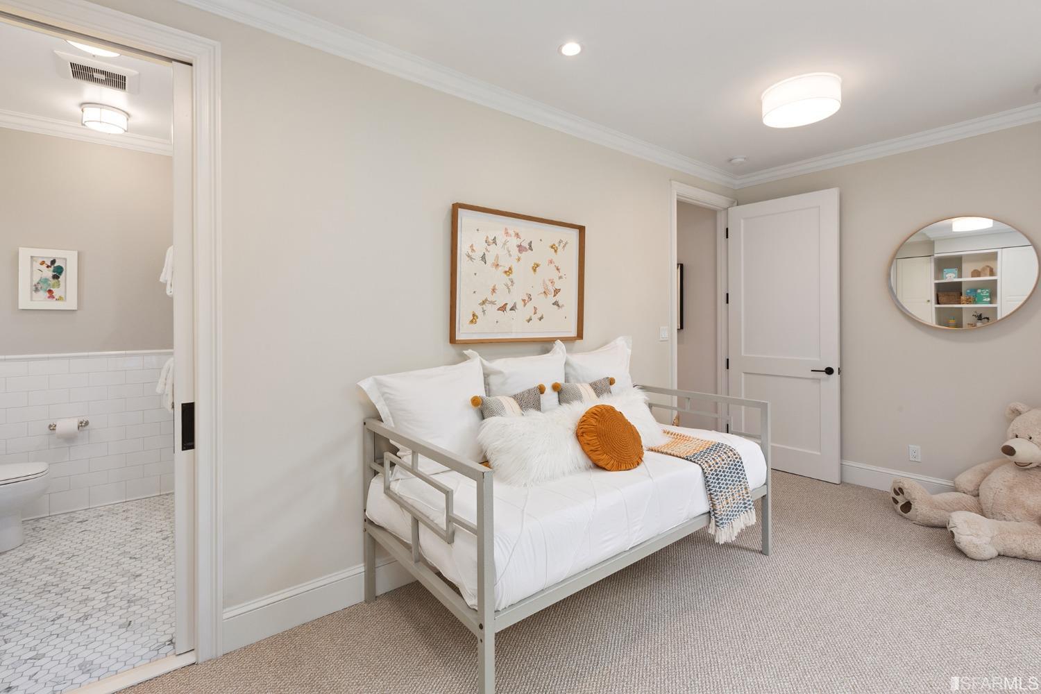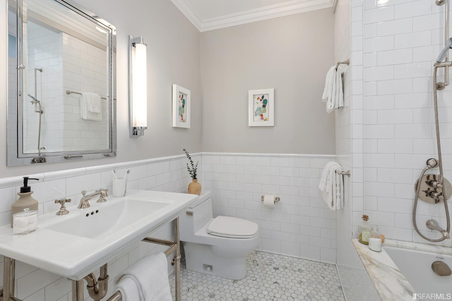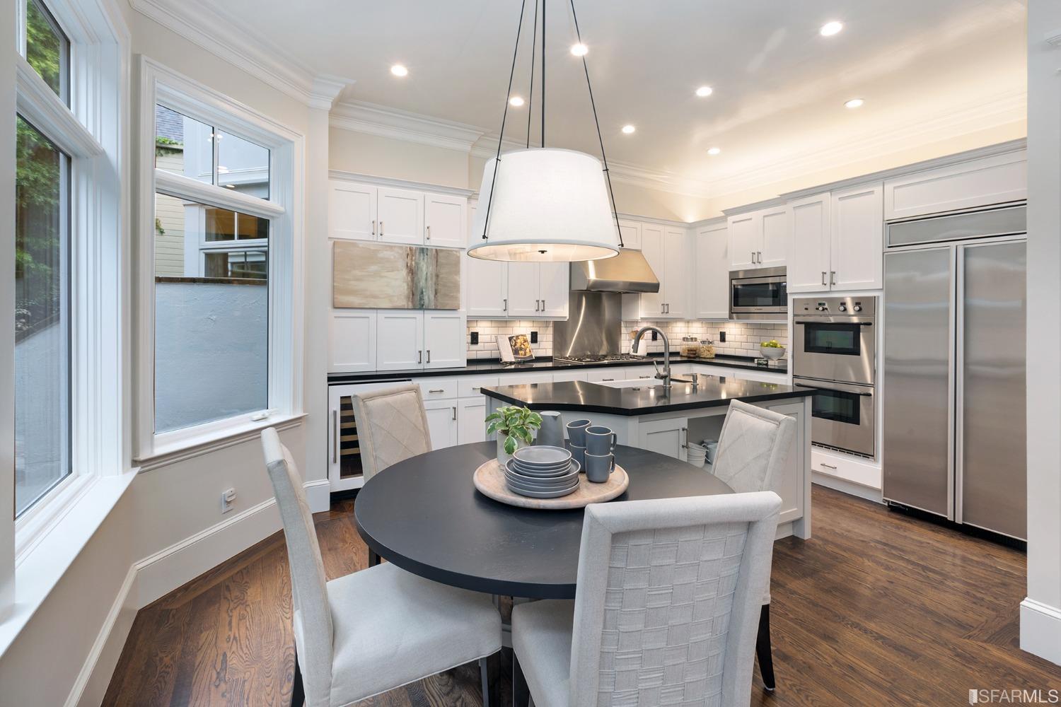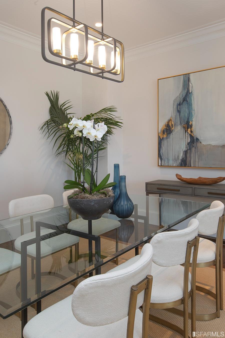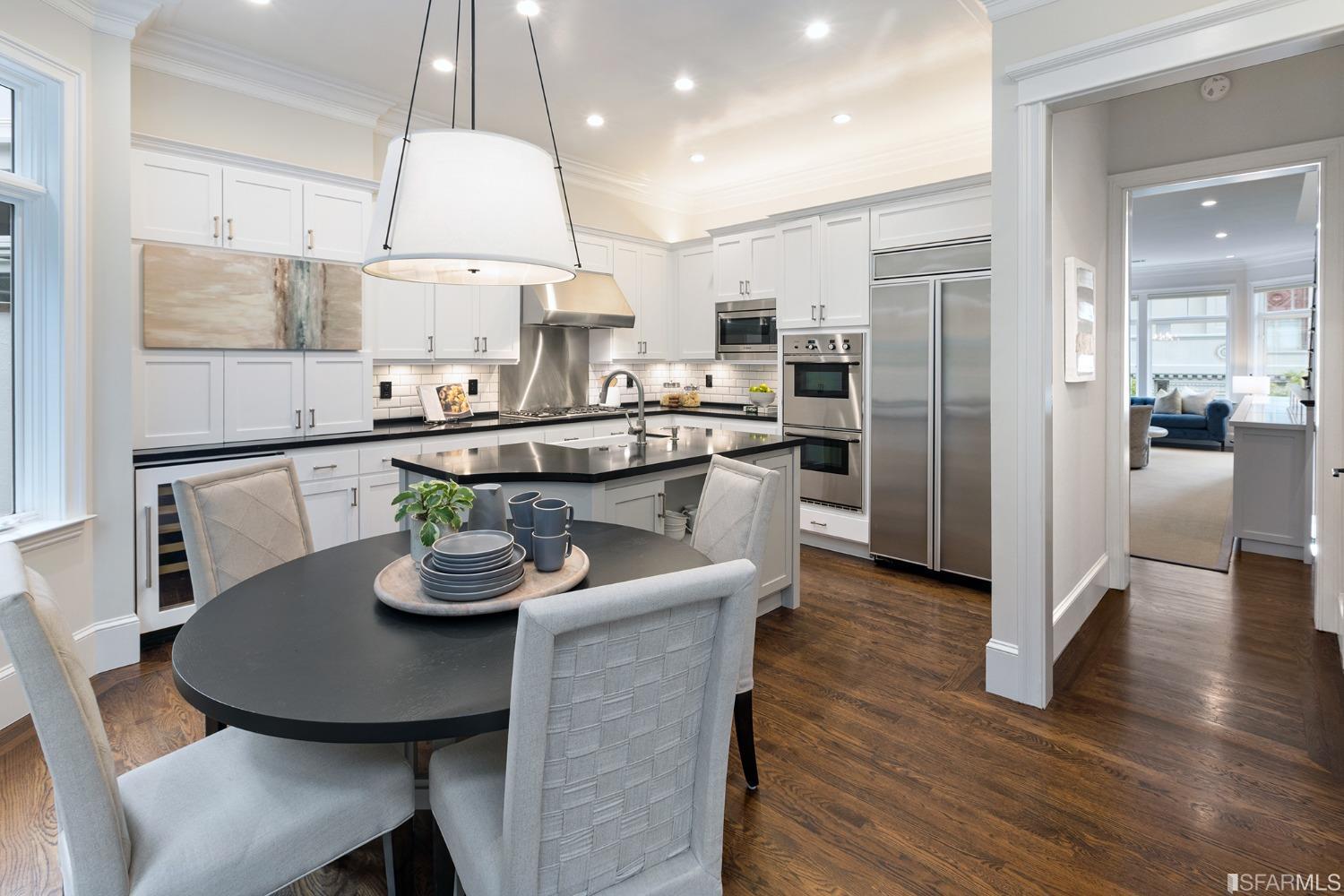 Video Preview! Northern edge of Pacific Heights, flat block close to Union St, built in 1997, 4 bed, 4 1/2 bath. Stone stairs lead from the sidewalk up to a private landing overlooking Vallejo. Four story home has living floor in the middle. Enter the foyer and up the stairs to the open living level with a dining room, wood burning fireplace and living room with bay windows. Powder room and updated kitchen are on the south side. Kitchen opens to the garden with an outdoor TV. Primary bedroom suite is on the top of the home facing north with French doors opening out to a Juliette balcony and a view of Alcatraz. The suite has built-in closets, a remodeled spacious bathroom with skylights. There is an en-suite bedroom on the south side. On the first living floor, there are two en-suite bedrooms and laundry. Rear bedroom opens to a patio. Internal stairs lead down to the mud room and a large two car garage with great storage.