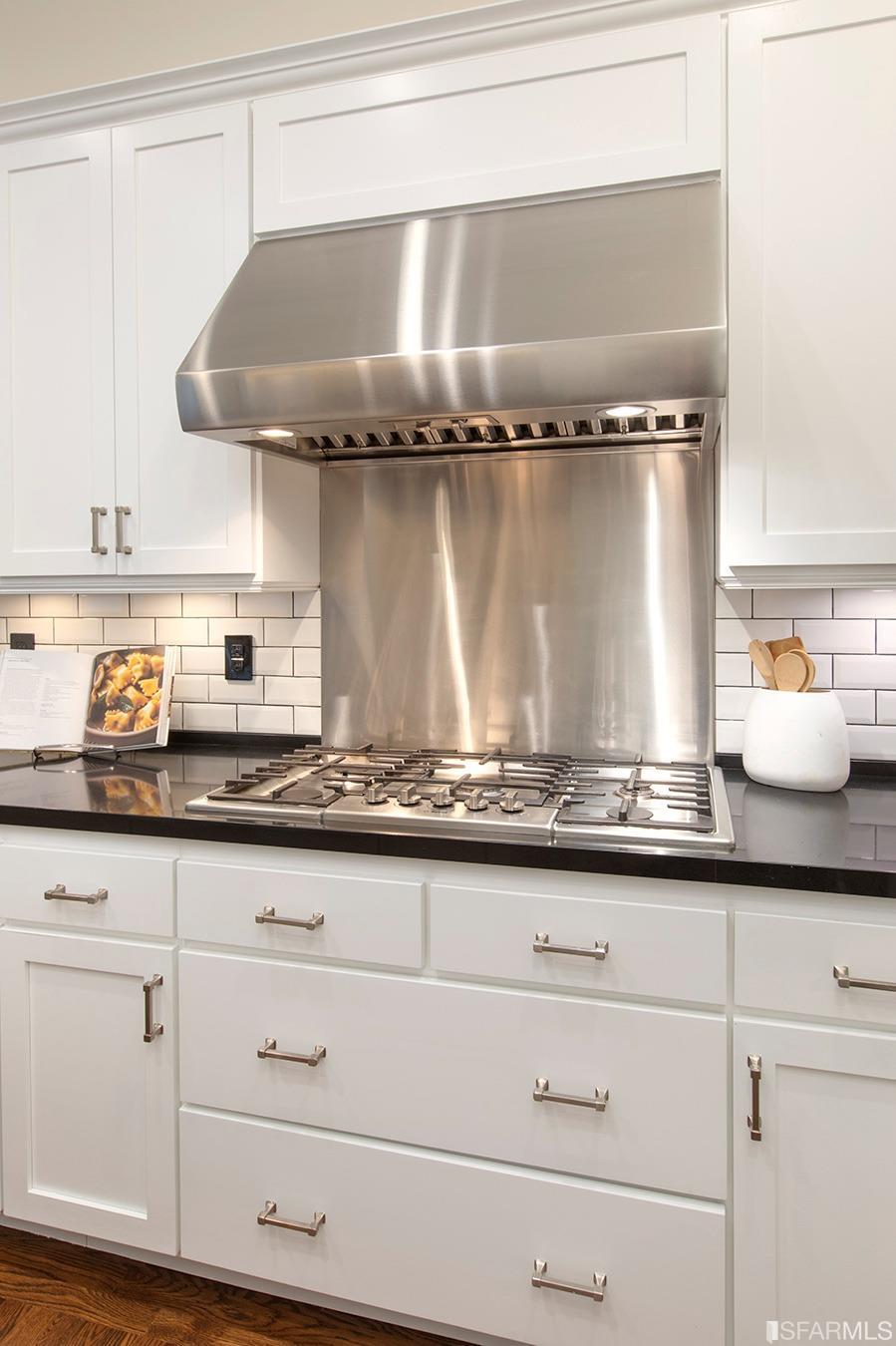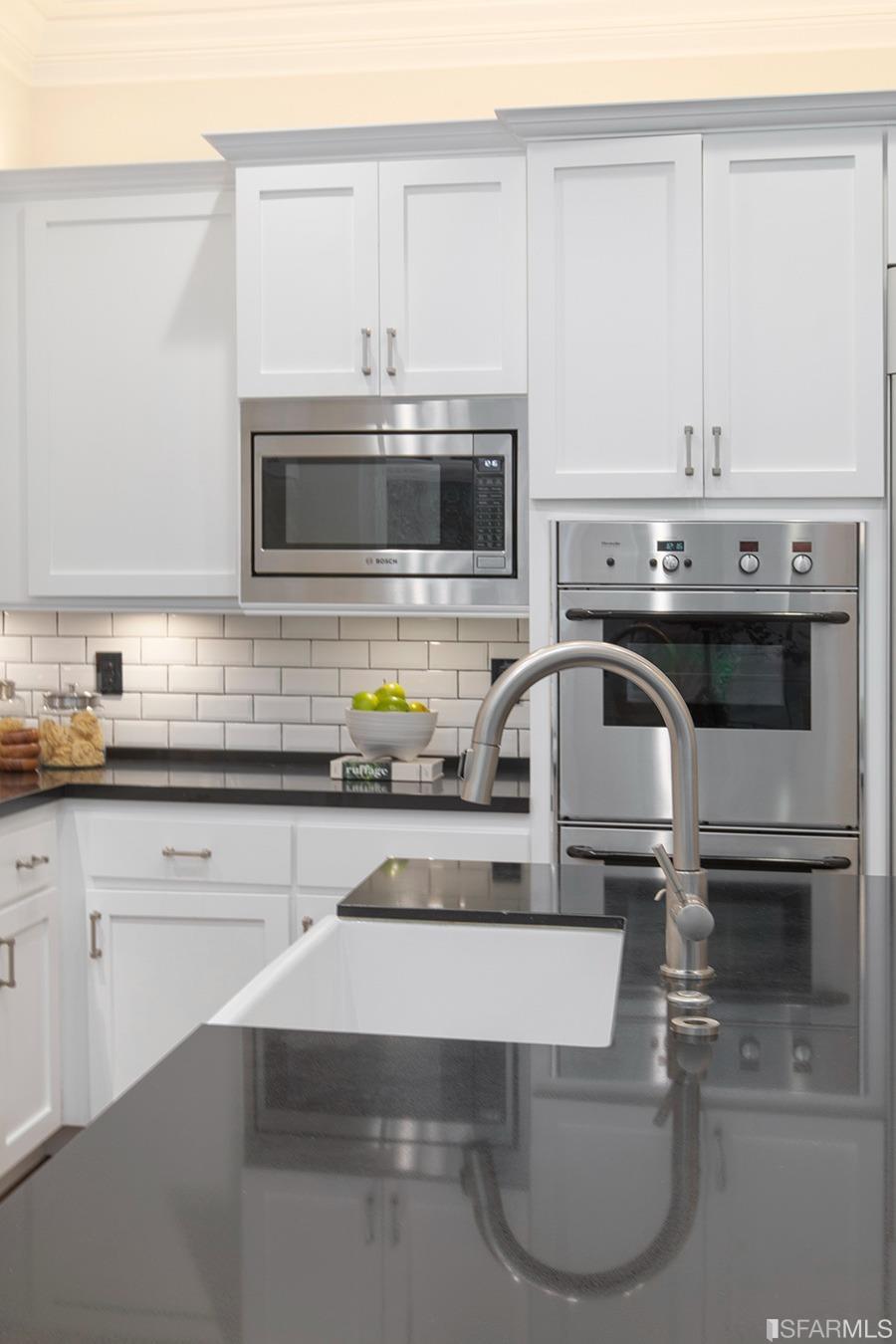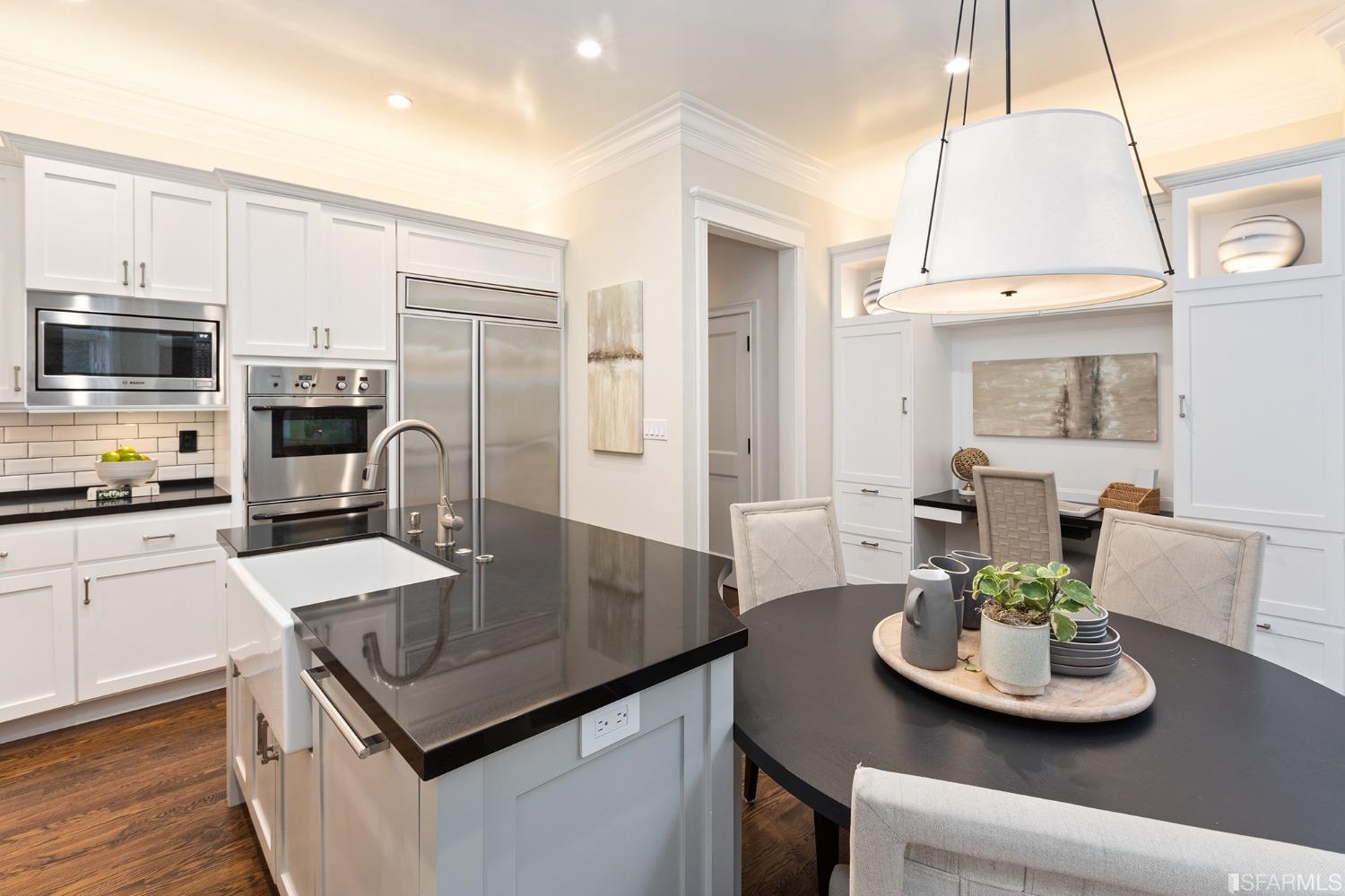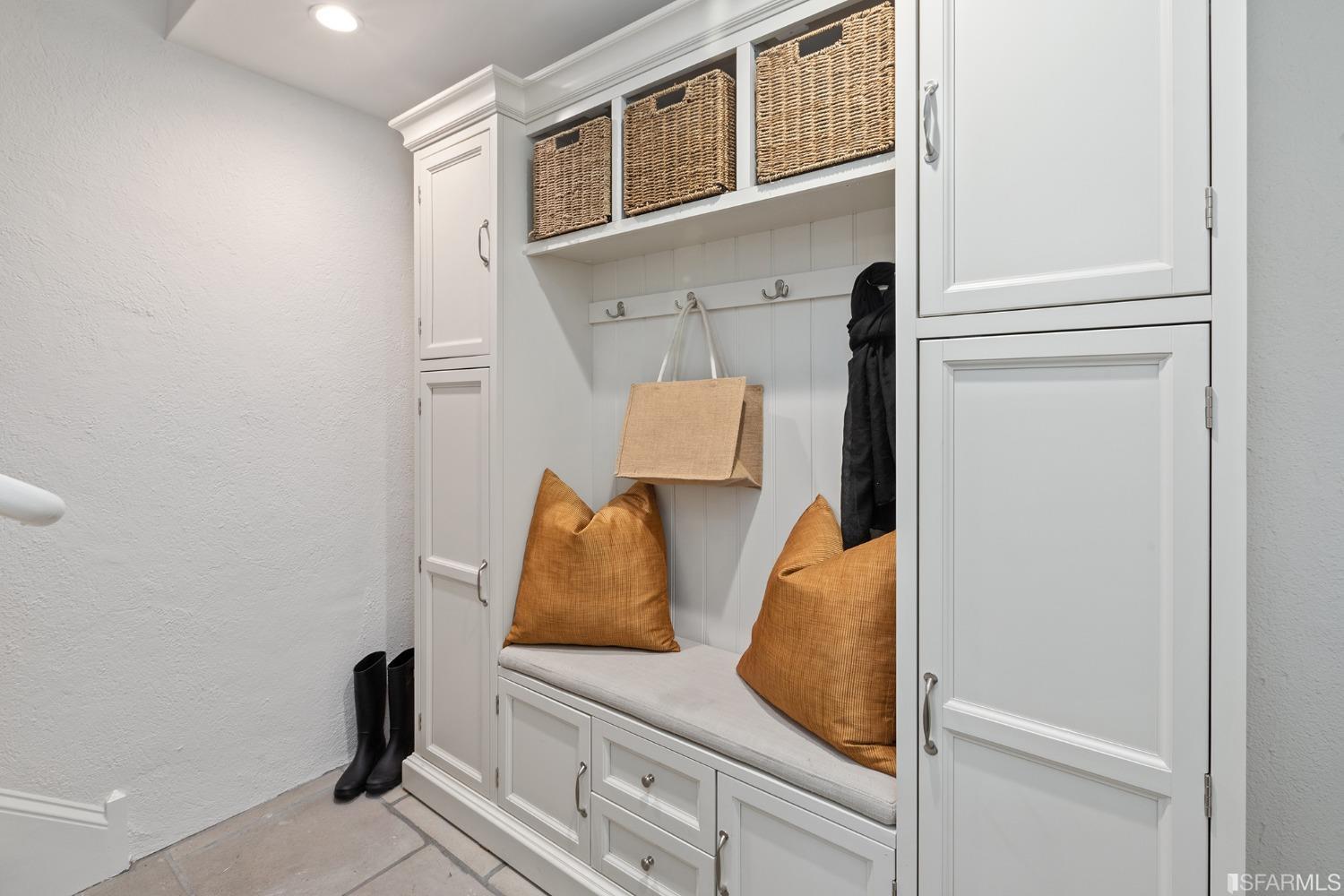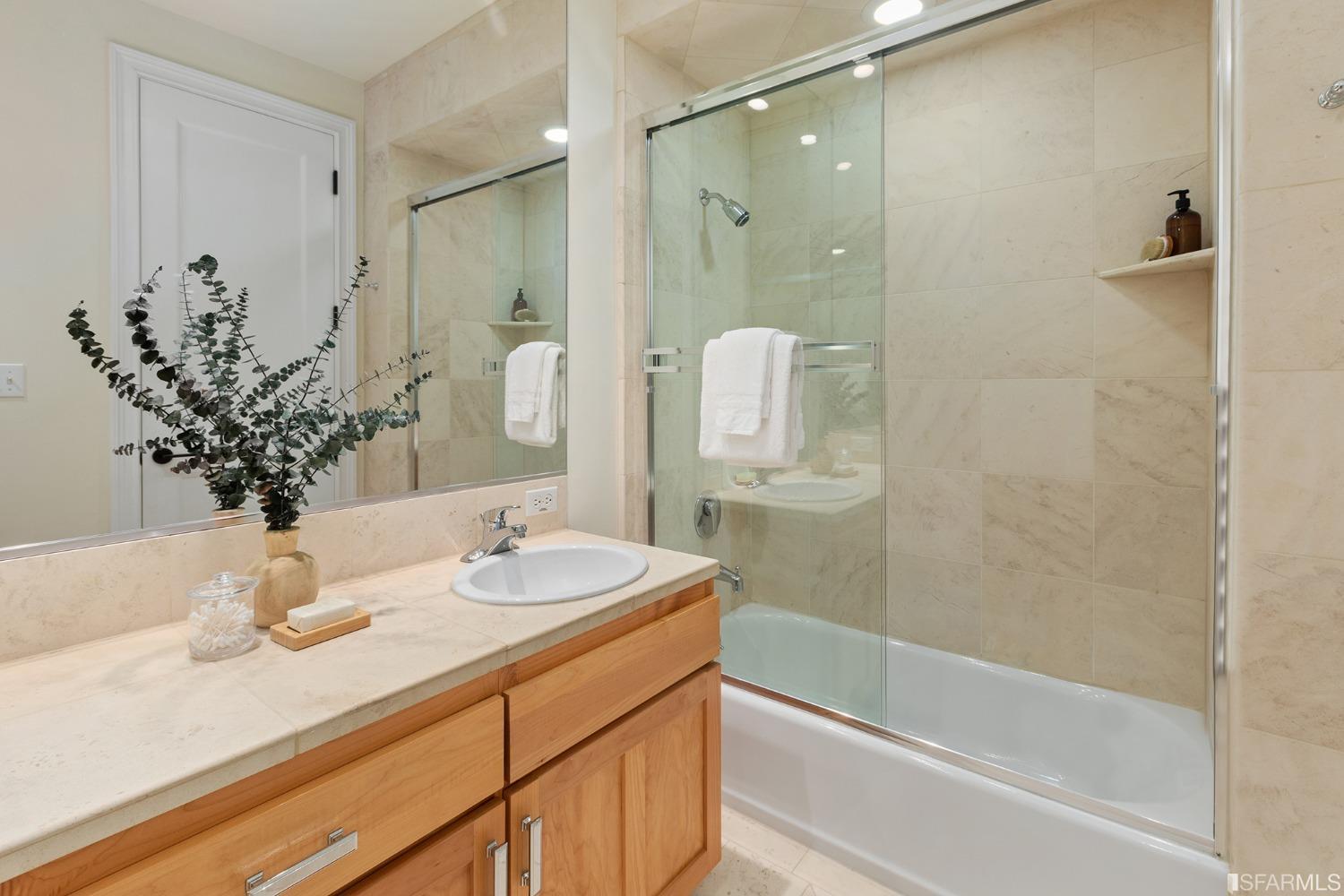 Video Preview! Northern edge of Pacific Heights, flat block close to Union St, built in 1997, 4 bed, 4 1/2 bath. Stone stairs lead from the sidewalk up to a private landing overlooking Vallejo. Four story home has living floor in the middle. Enter the foyer and up the stairs to the open living level with a dining room, wood burning fireplace and living room with bay windows. Powder room and updated kitchen are on the south side. Kitchen opens to the garden with an outdoor TV. Primary bedroom suite is on the top of the home facing north with French doors opening out to a Juliette balcony and a view of Alcatraz. The suite has built-in closets, a remodeled spacious bathroom with skylights. There is an en-suite bedroom on the south side. On the first living floor, there are two en-suite bedrooms and laundry. Rear bedroom opens to a patio. Internal stairs lead down to the mud room and a large two car garage with great storage.
